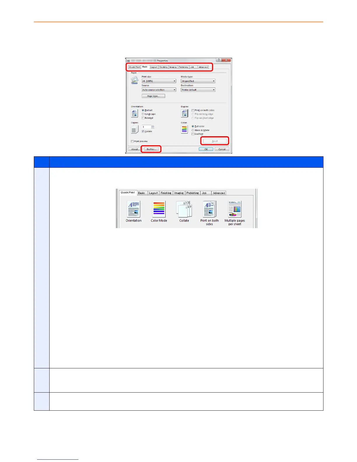 This tab lets you configure settings related to the quality and color mode of the print results.