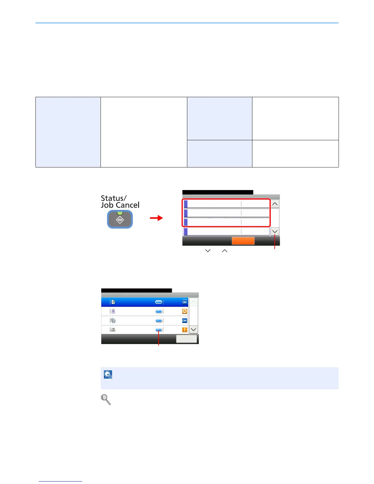The job histories are displayed separately in three screens - Printing Jobs, Sending Jobs, and Storing Jobs. The