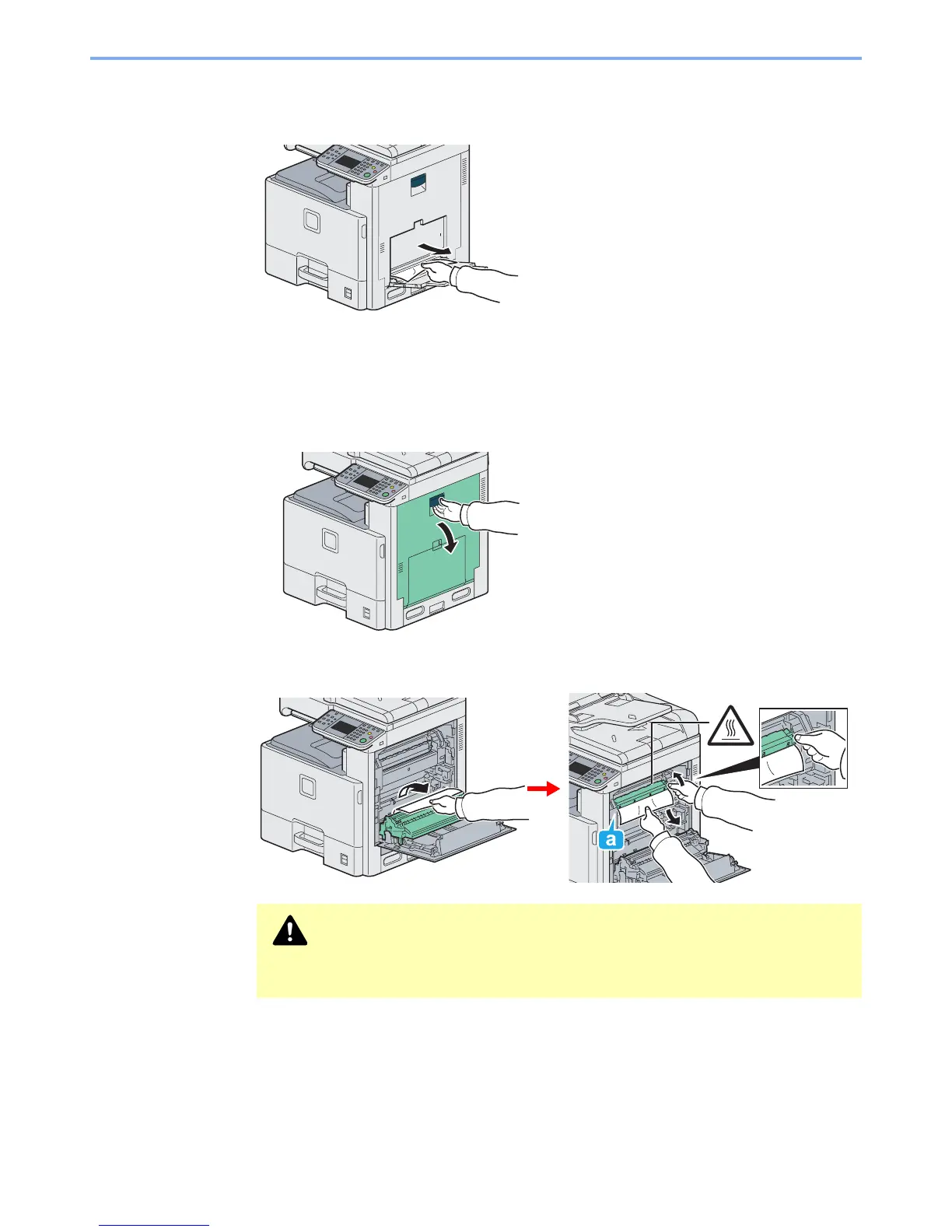 The fixing unit is extremely hot. Take sufficient care when working in this area, as