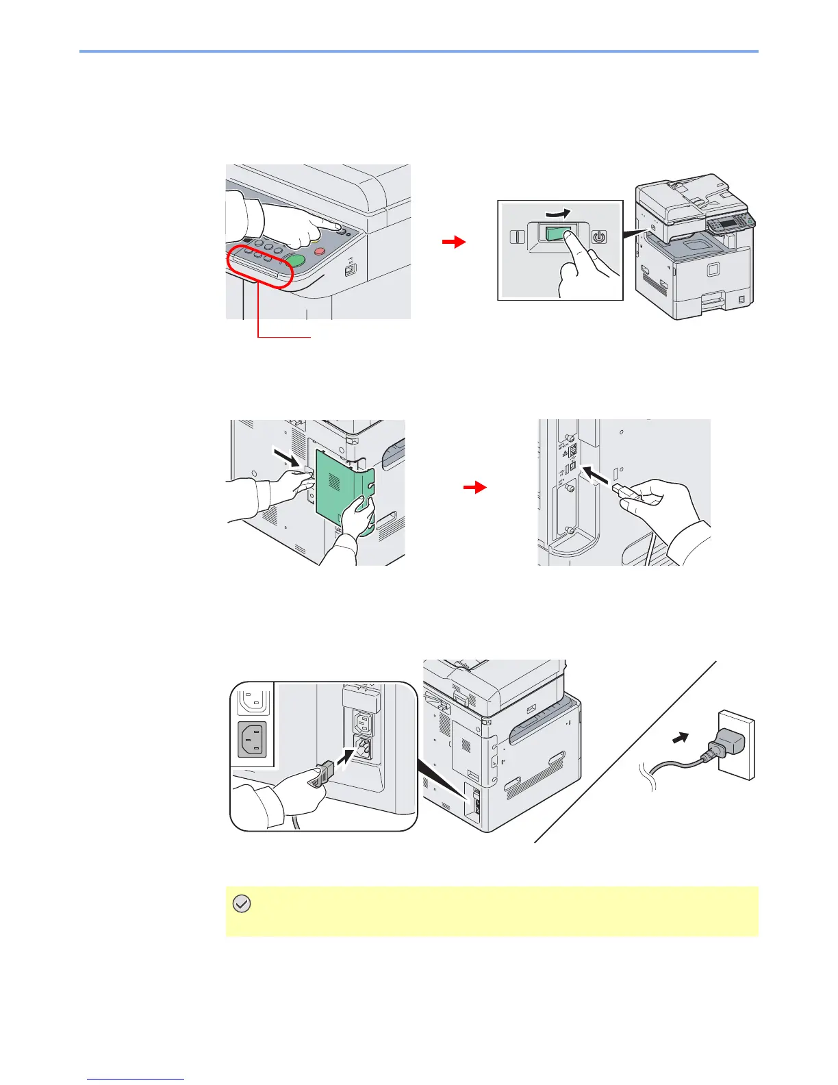 Connect one end of the supplied power cable to the machine and the other end to a power