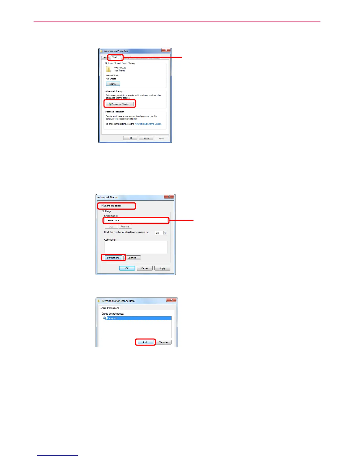 2 Right-click the scannerdata folder and click Share and Advanced sharing. Click the