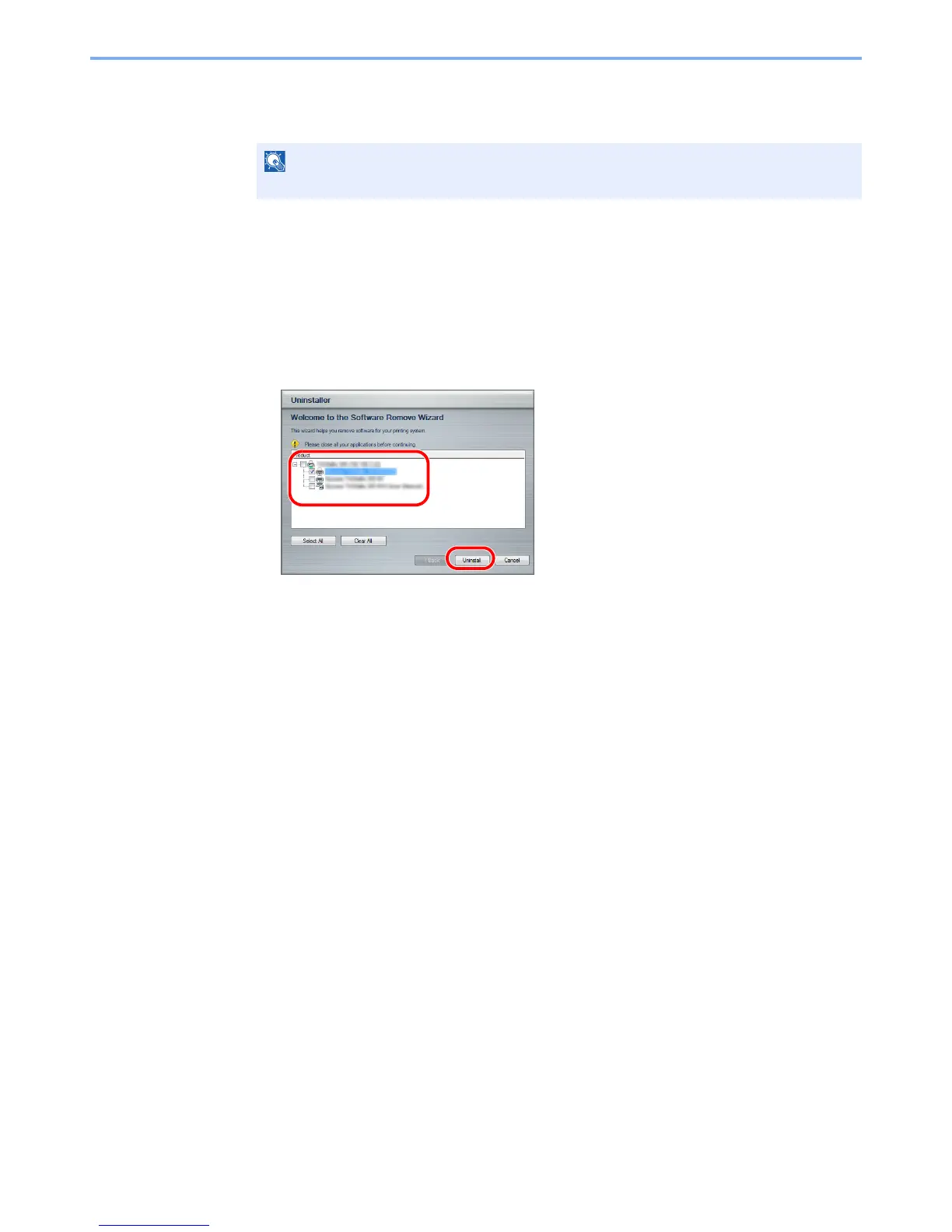(name of product), and Uninstall Printing System Library to display the Uninstall Wizard.