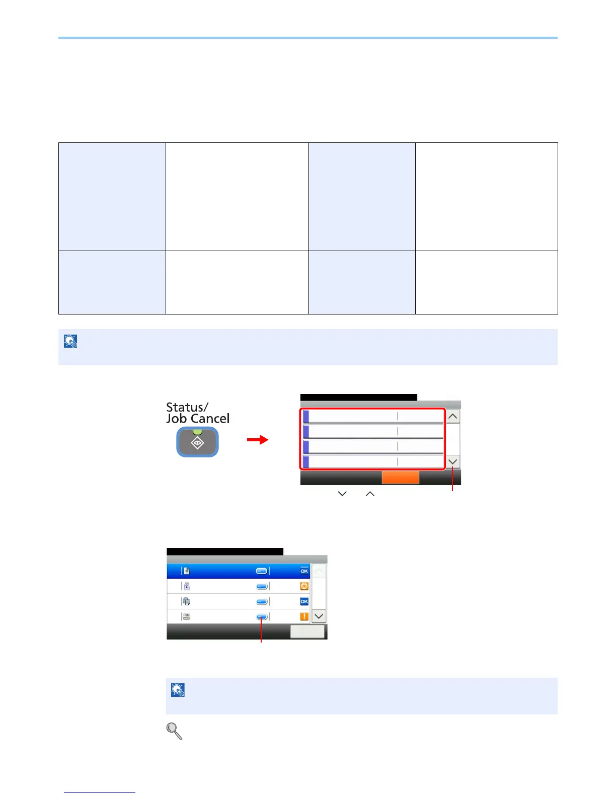 The job histories are displayed separately in four screens - Printing Jobs, Sending Jobs, Storing Jobs, and FAX Jobs.