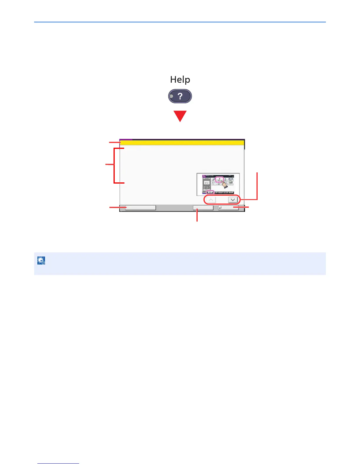 To show the Help screen, press the [Help] key on the operation panel. The Help screen shows explanations of functions