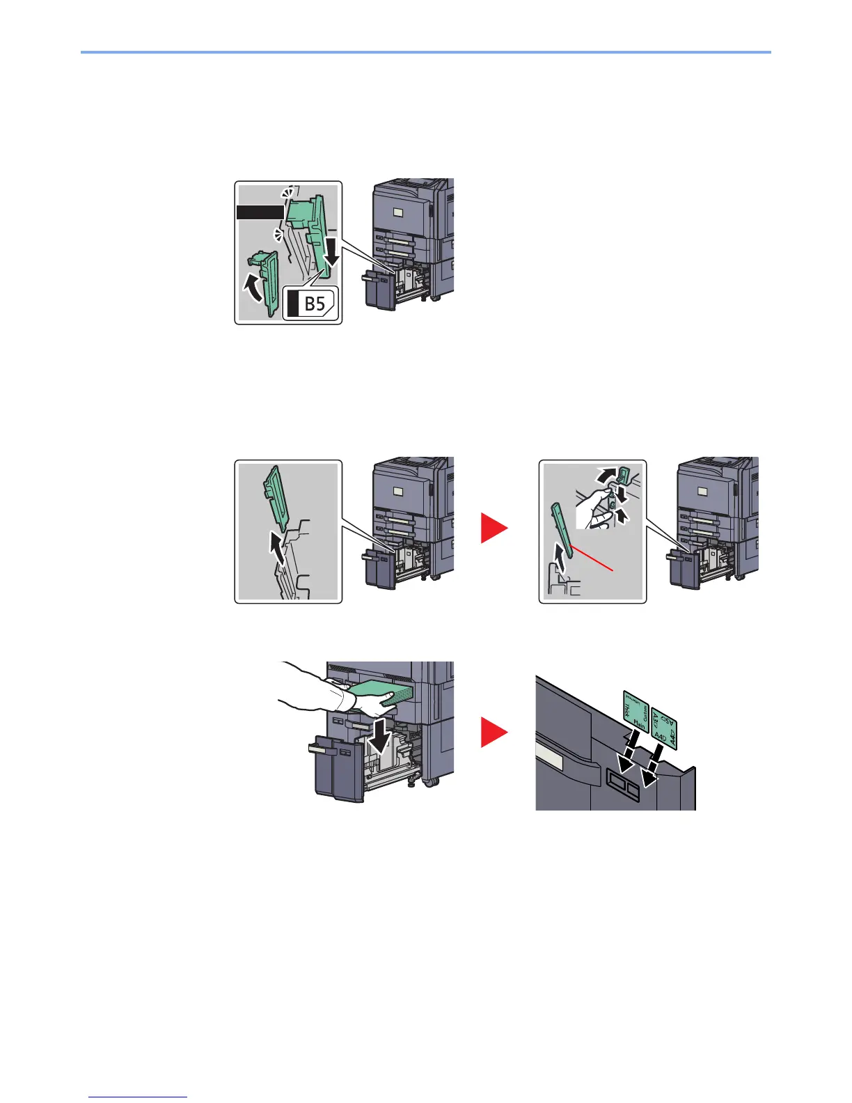 Open the Paper Size Guide (B) as shown, insert into the slot marked B5 (on the bottom of the