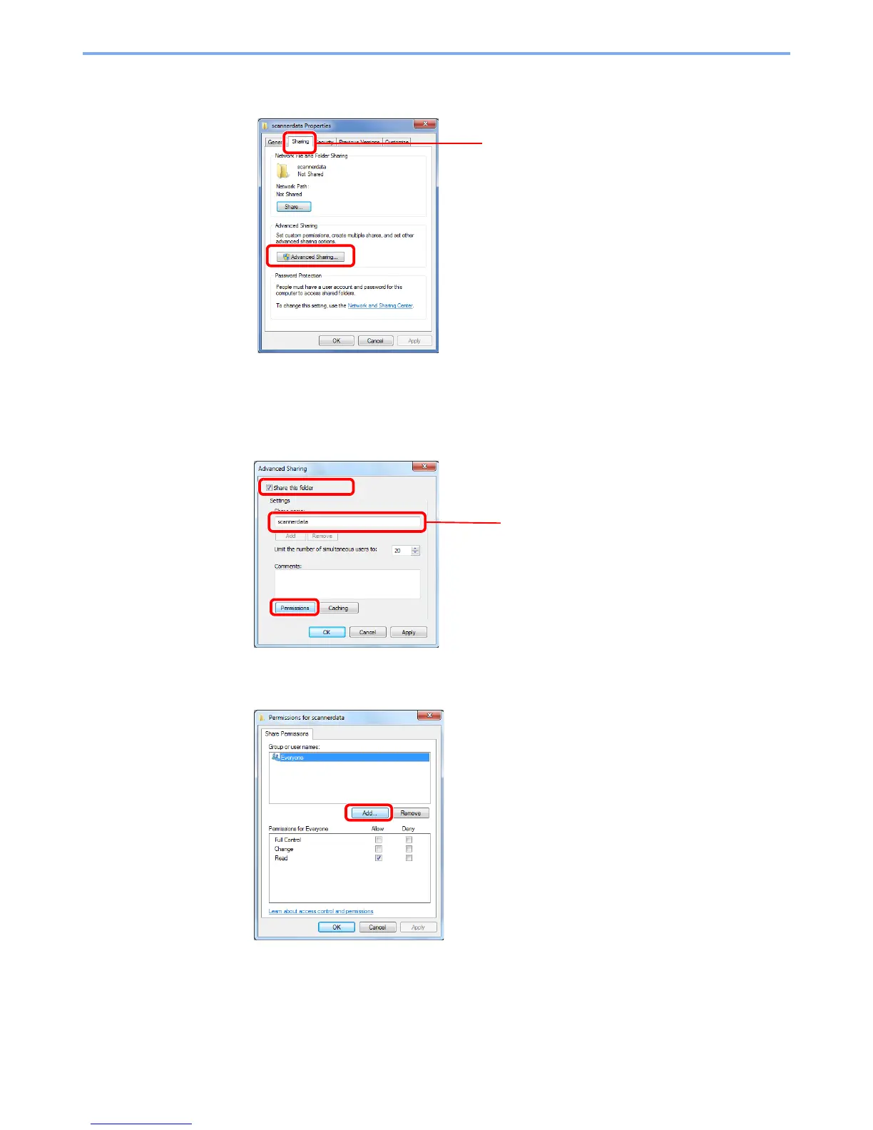 2 Right-click the "scannerdata" folder and click [Share] and [Advanced sharing]. Click the