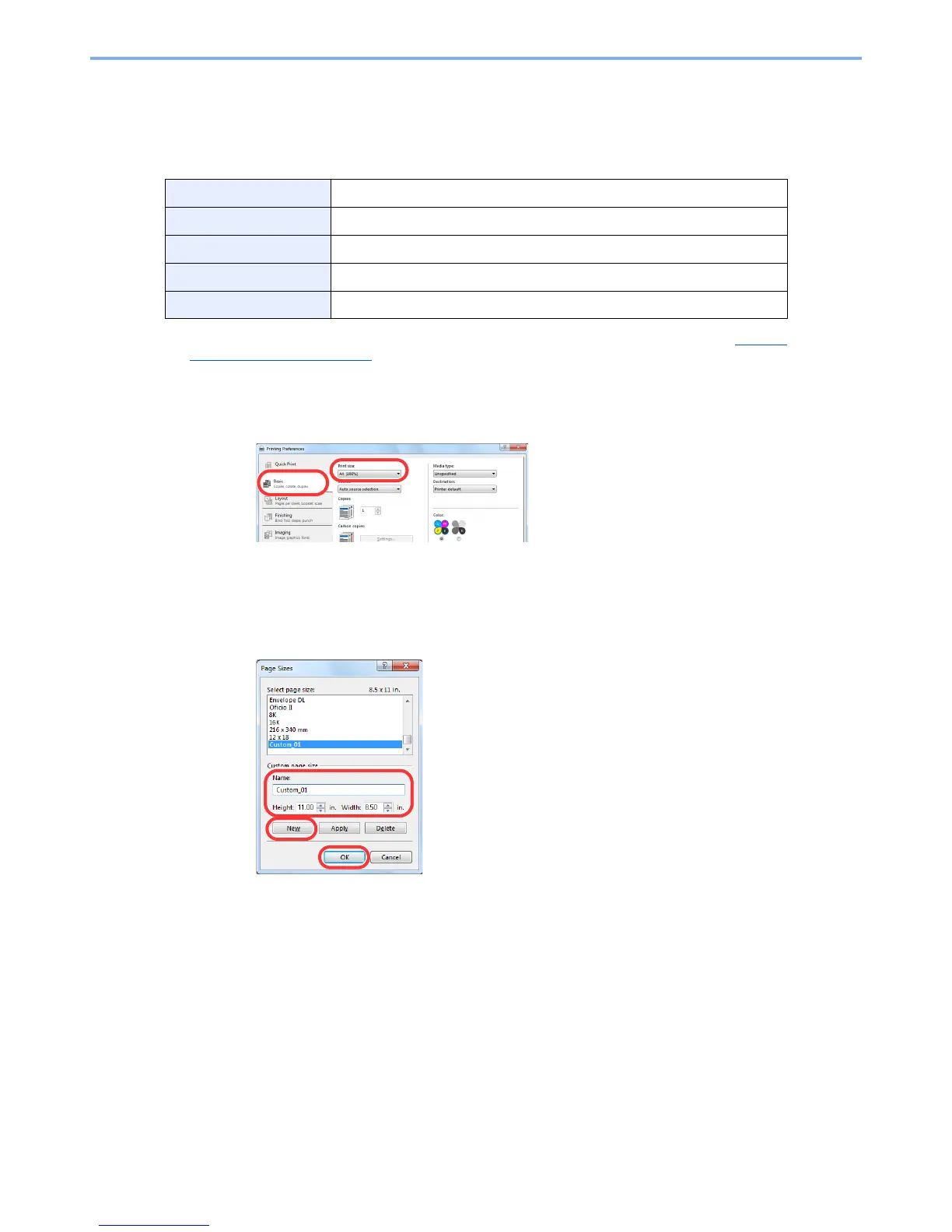 2 Enter the name, length (470.1 mm (18.51") or longer), and width of the custom paper size