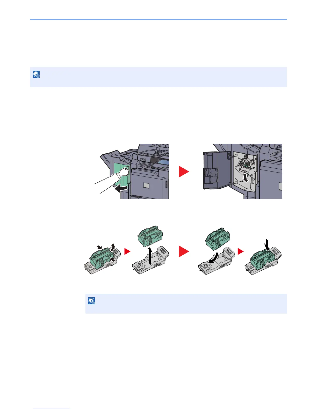 A staple cartridge is installed in the optional 1,000-sheet finisher, 4,000-sheet finisher, and center-fold unit.