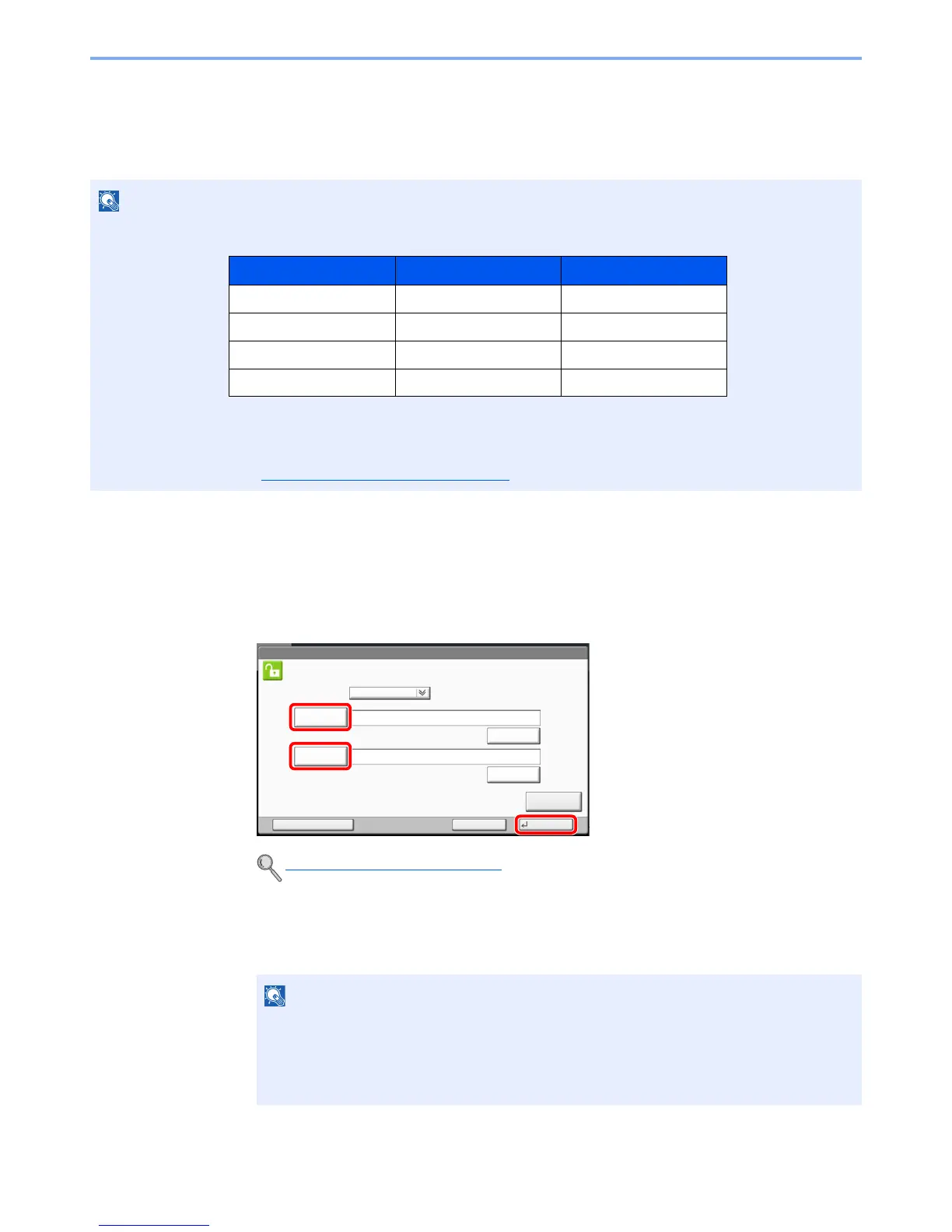 If you are setting a function that requires administrator rights, or if user login administration is enabled, you must enter