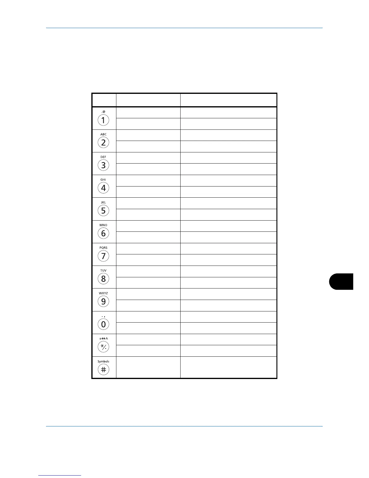 Referring to the table below, press the key corresponding to the character you want to enter until it is displayed.