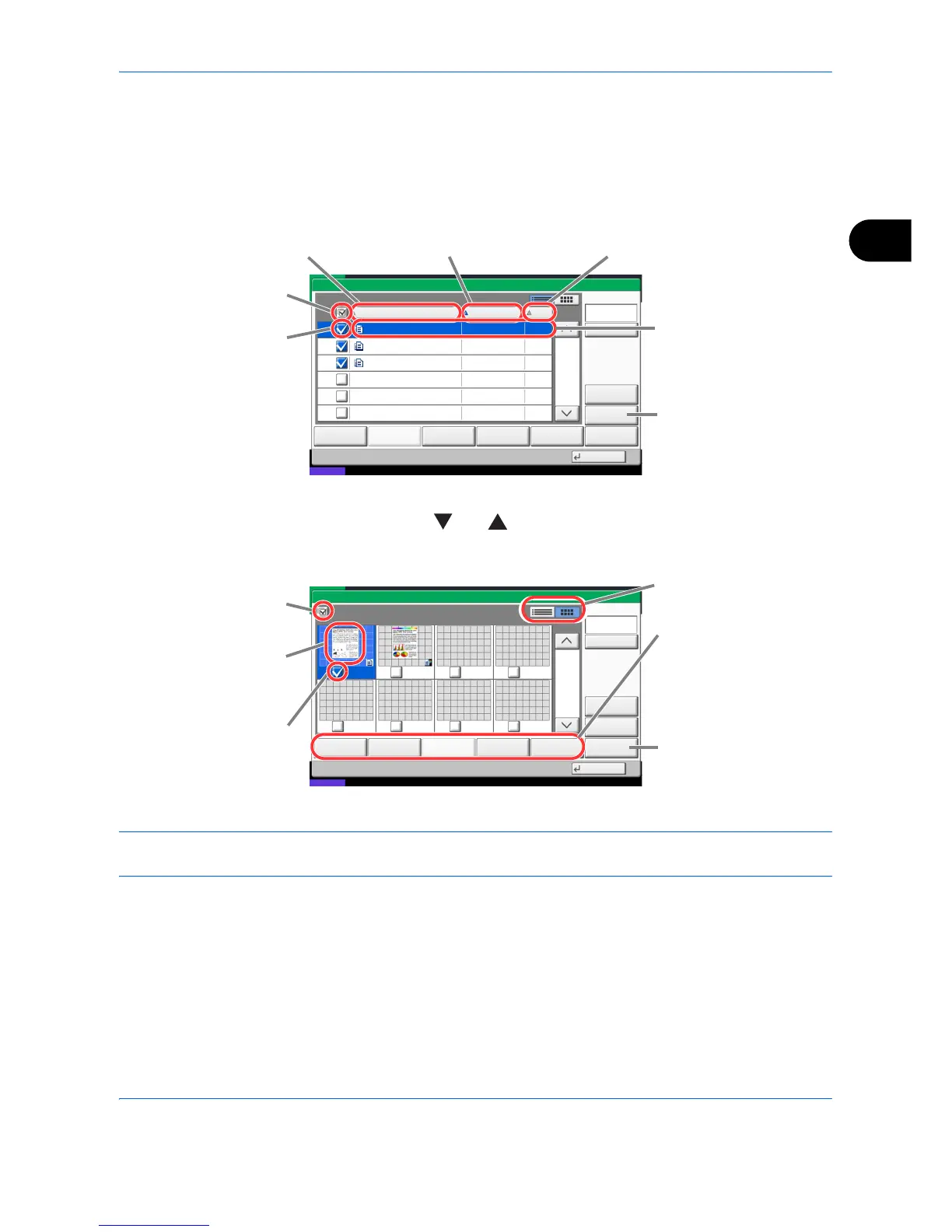 The document list is a list of the documents stored in the custom box. Documents can be listed either by name