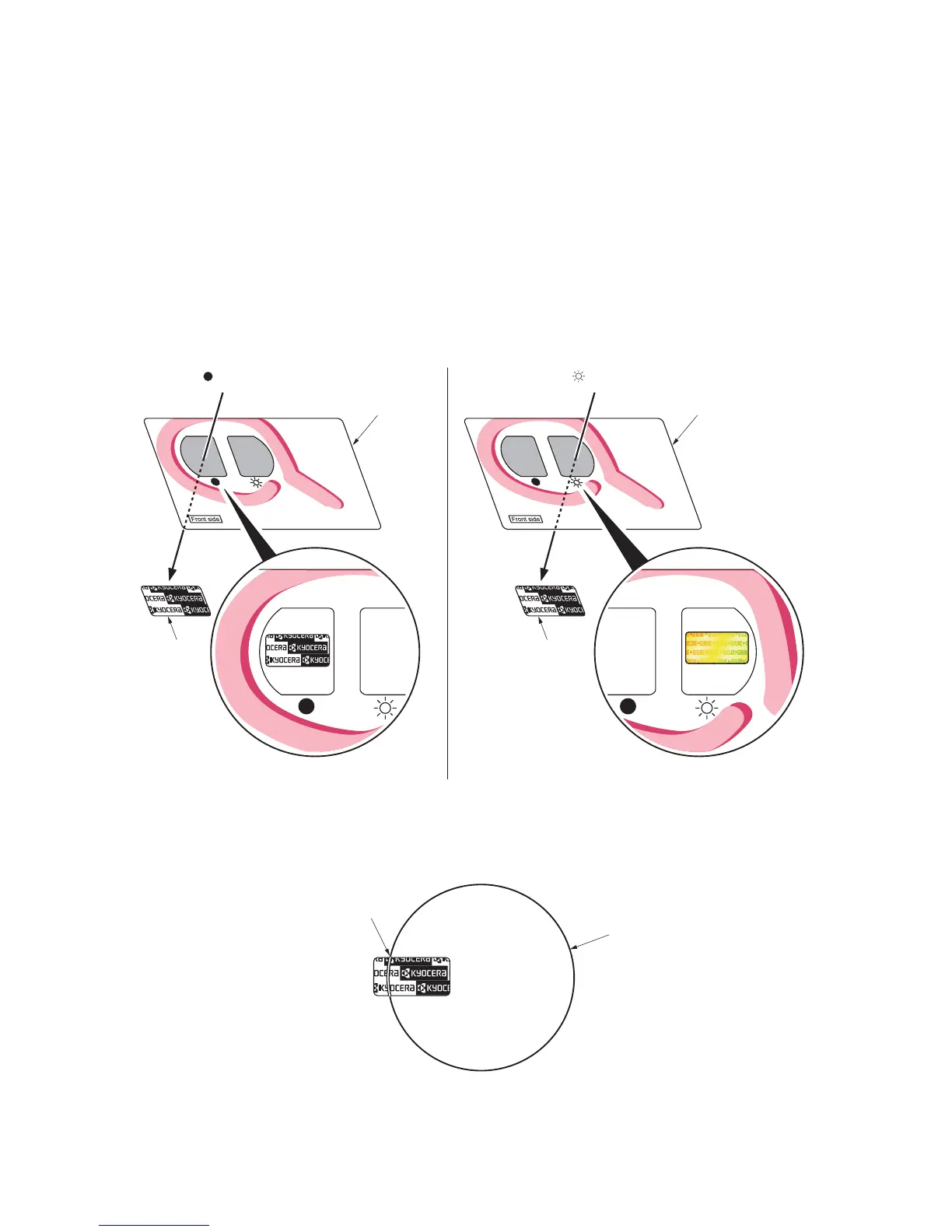 Hold the validation viewer over the left side part of the brand protection seal on the toner container. Through each window