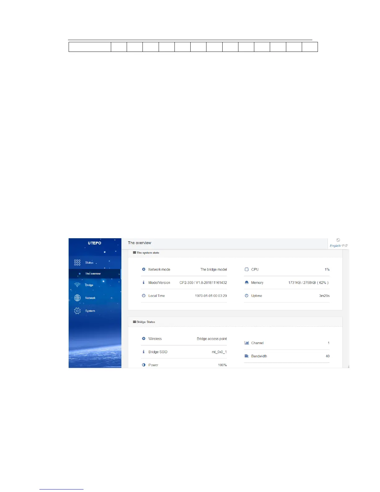 The page is including the status of system, bridge and interface, shown as below.
