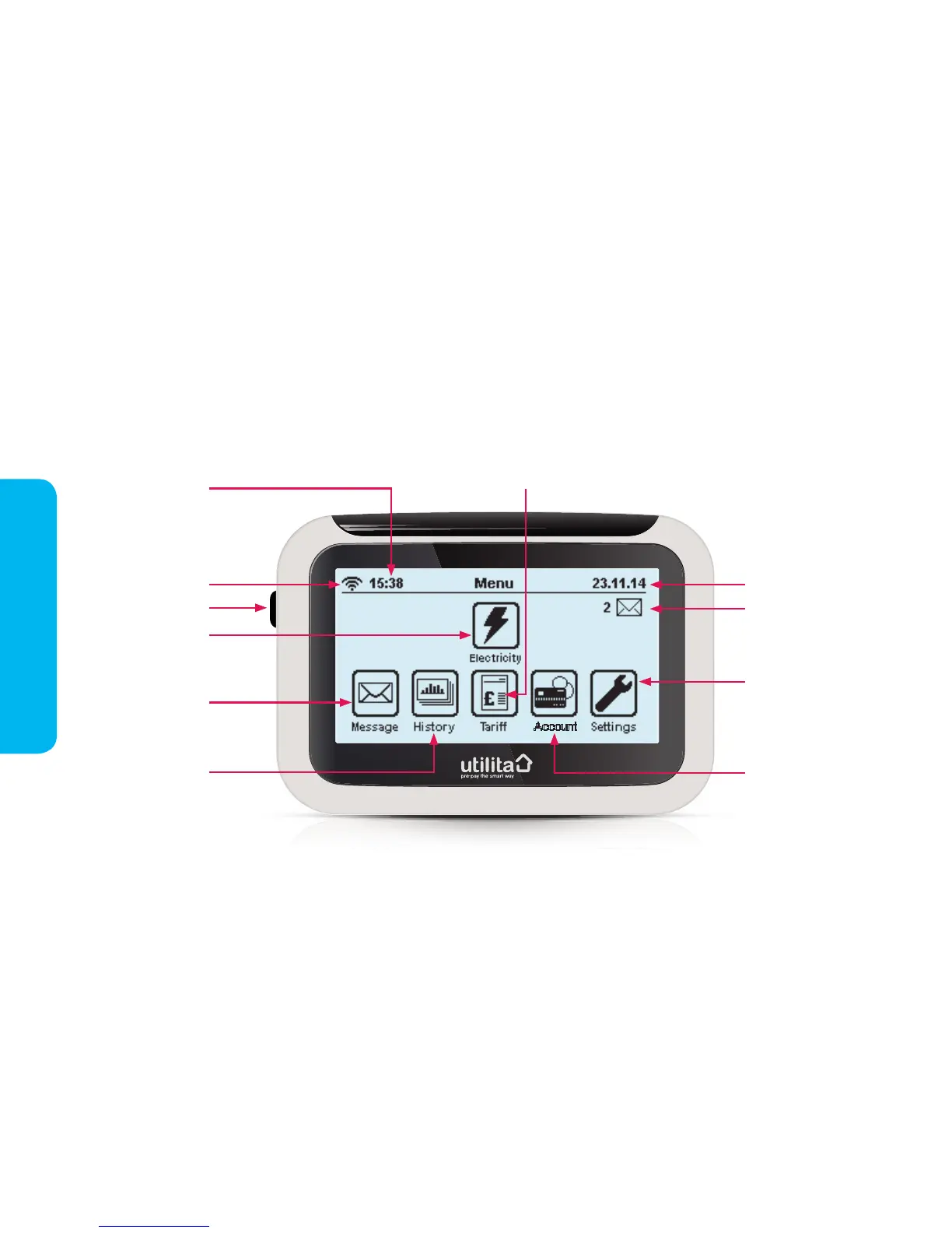 smart meter features. Below is the 'Main Menu' screen which can be accessed by pressing the 'Menu' button in the top