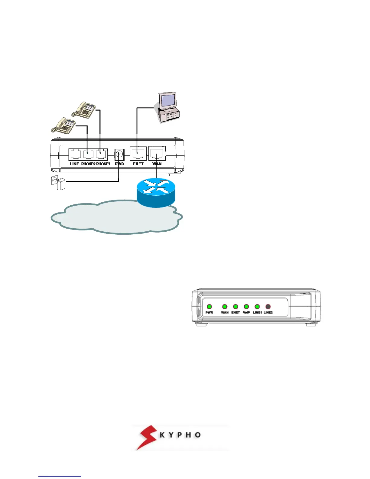 At the end of the connections, the “PWR”, “WAN”, “ENET”, and “VoIP” LEDs will light: