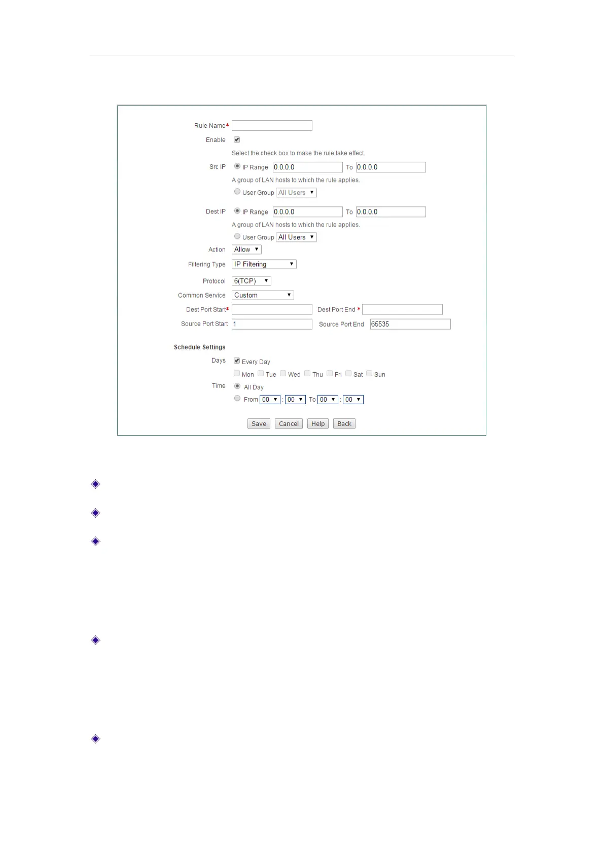 Dest IP: Specify the destination IP addresses of the packets to which the access