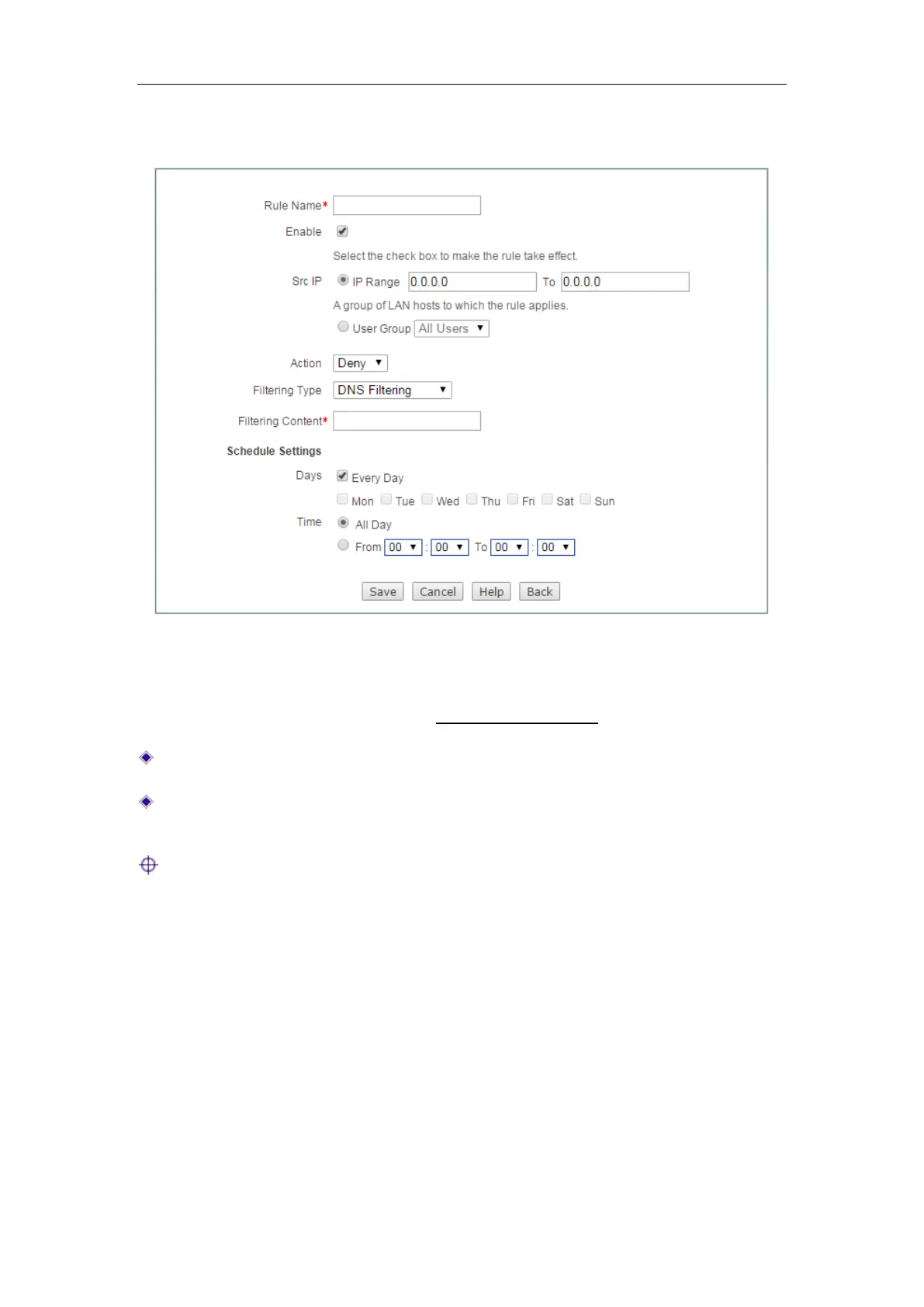 The setting of Rule Name, Enable, Src IP, Action, Schedule Settings is the same with