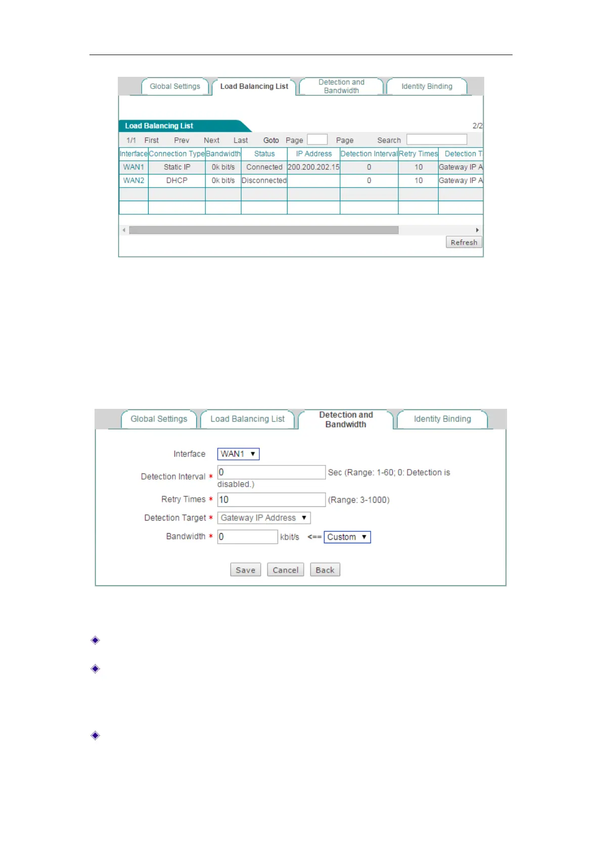 In the Network > Load Balancing > Detection and Bandwidth page, you can configure