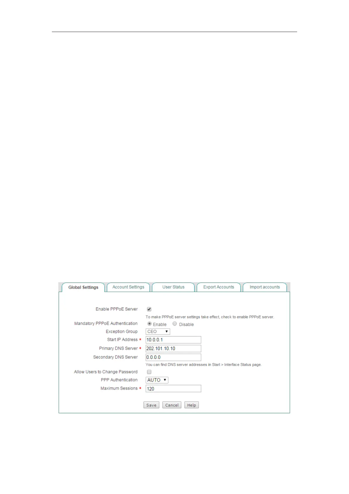 When acting as a PPPoE server, the Device dynamically will assign the IP addresses