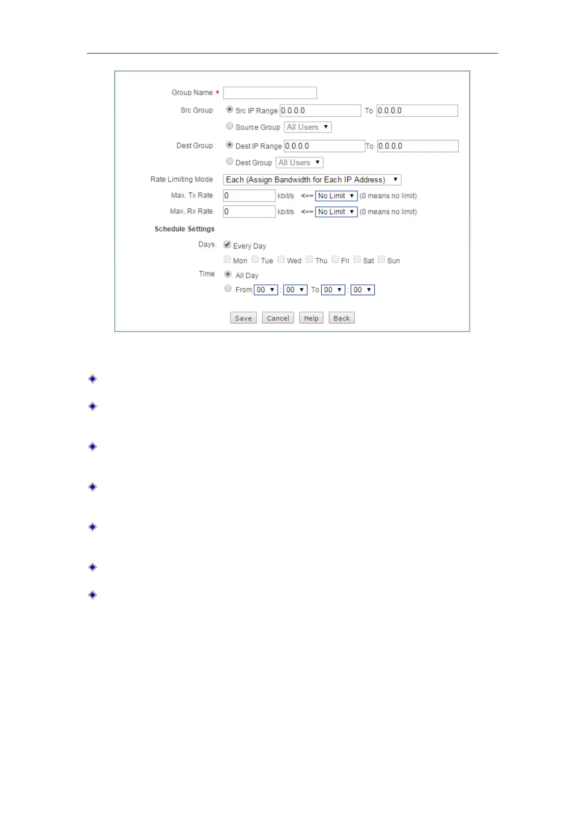 Dest Group: Specify the range of destination IP addresses to which the fixed rate