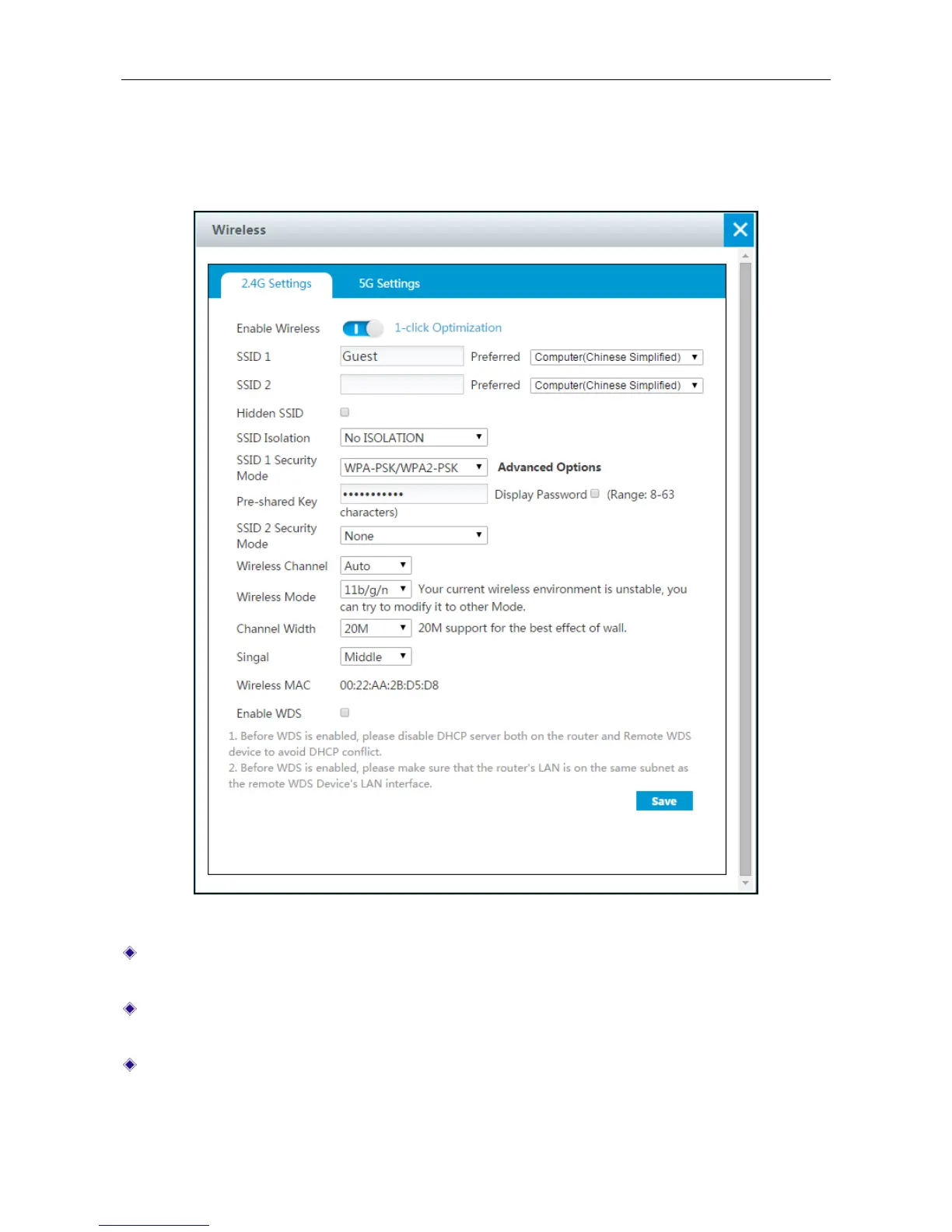 Enable Wireless: Click to open 2.4GHz Wireless network. When the wireless network is bad,