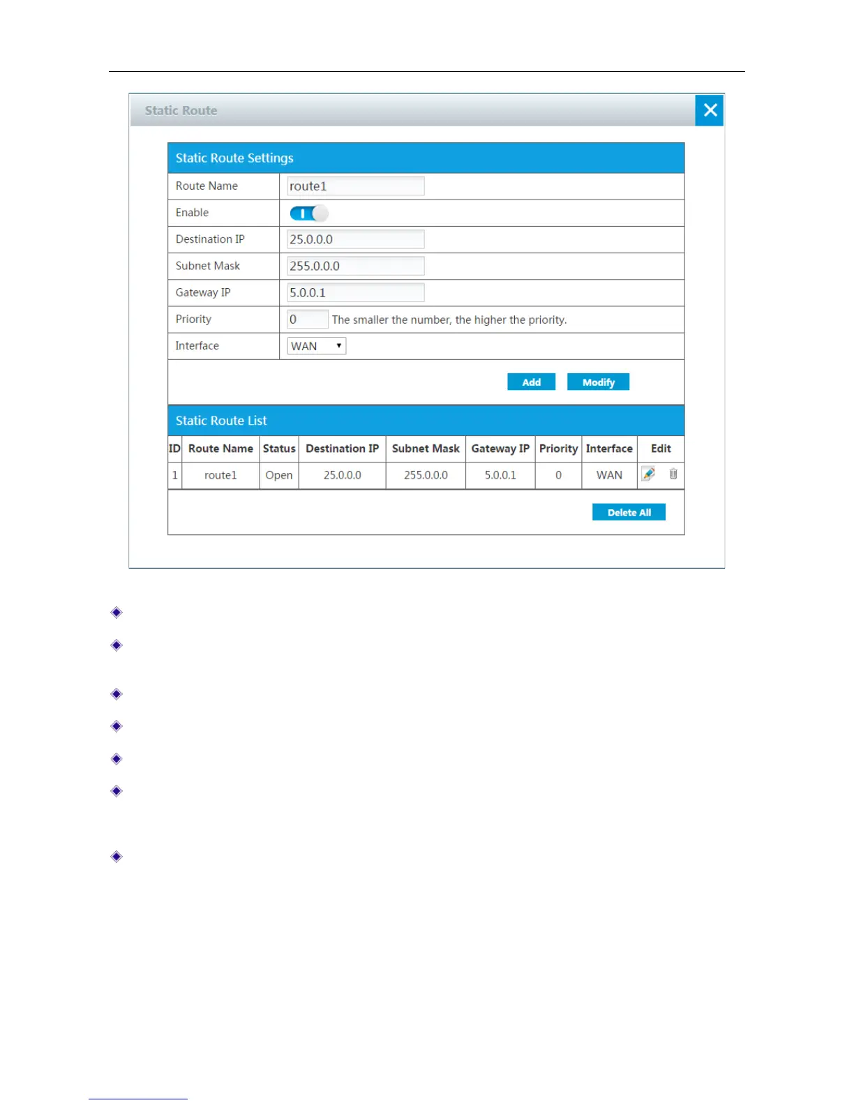 destination with different priorities, the Device will choose the route with the highest priority to