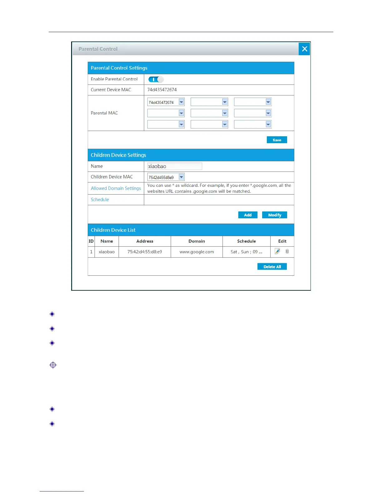 Parental MAC: Specify the parental MAC address which will not be affected by Parental