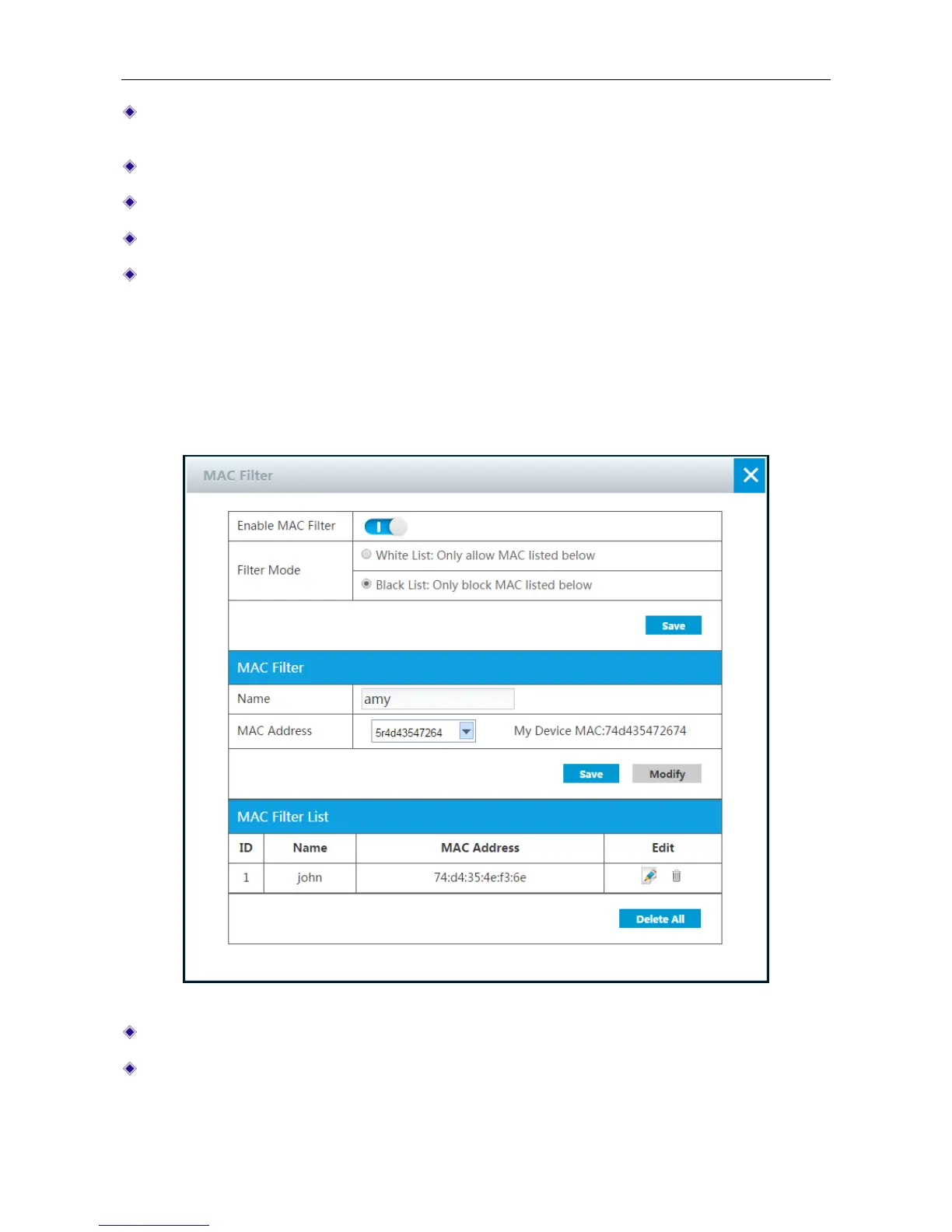 filter the wireless clients based on their MAC addresses. With this feature, you can either allow or