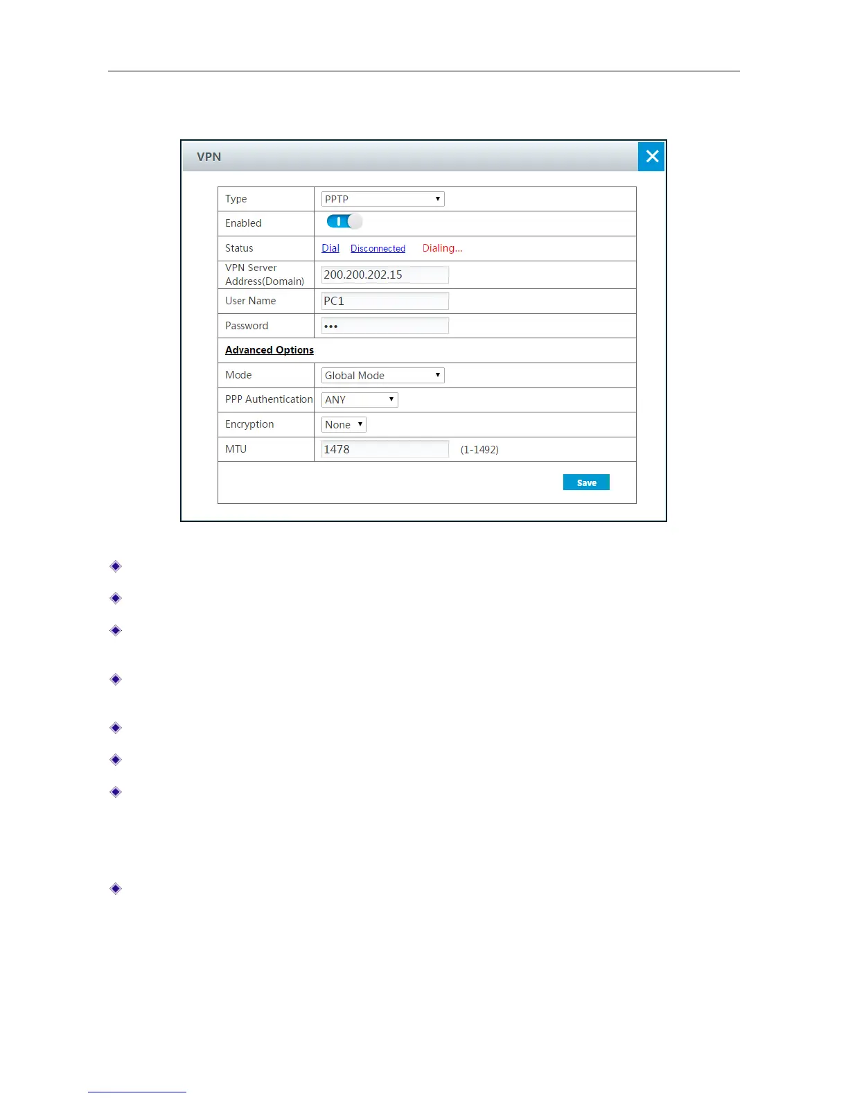 User Name: Enter the user name of the client which has been set on the VPN server.