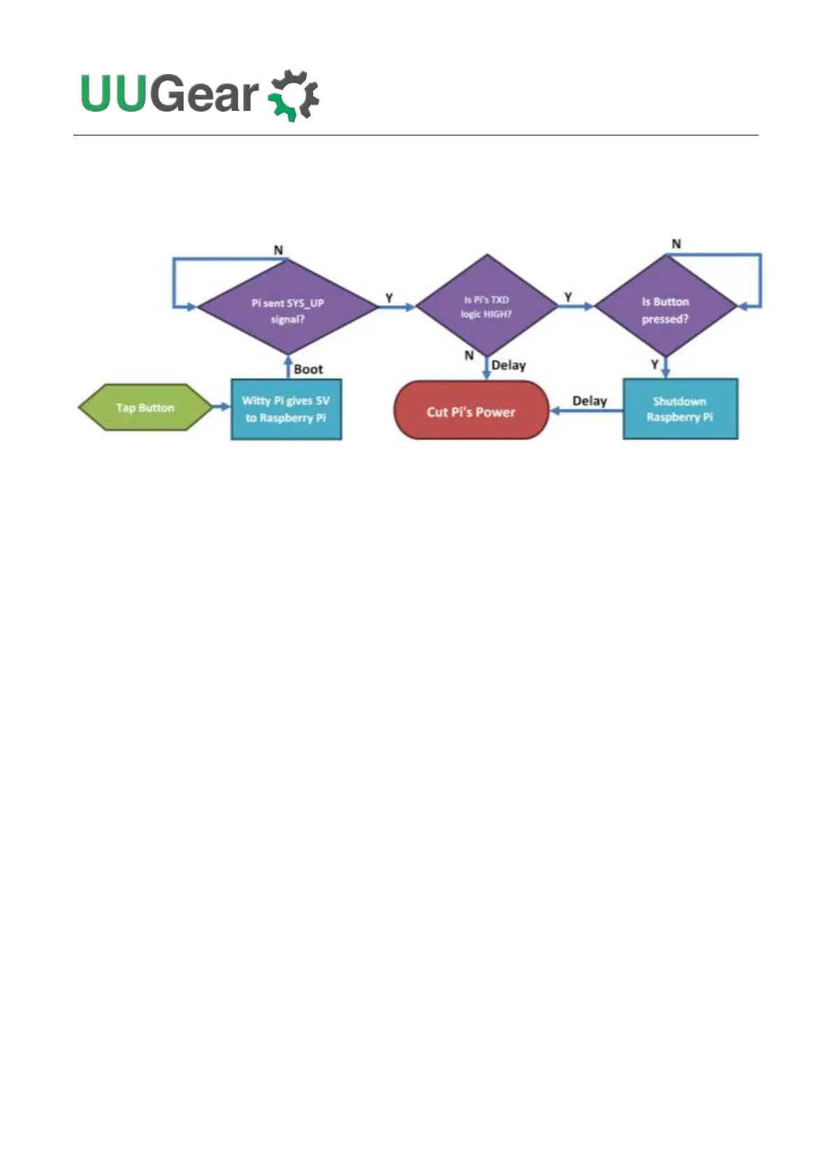 The diagram below shows the basic workflow of how Witty Pi turns on/off your Raspberry Pi.