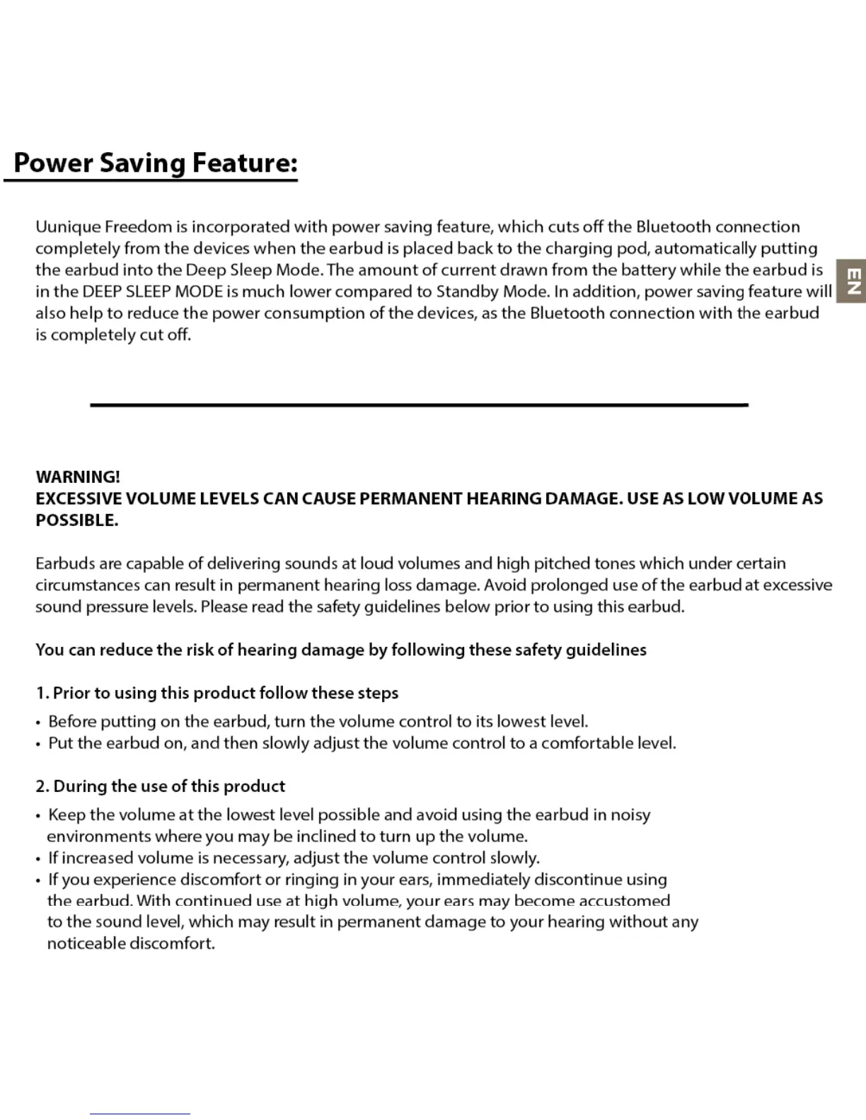 Uunique FREEDOM - Power Saving Feature; Hearing Safety Warning; Minimizing Hearing Damage Risk