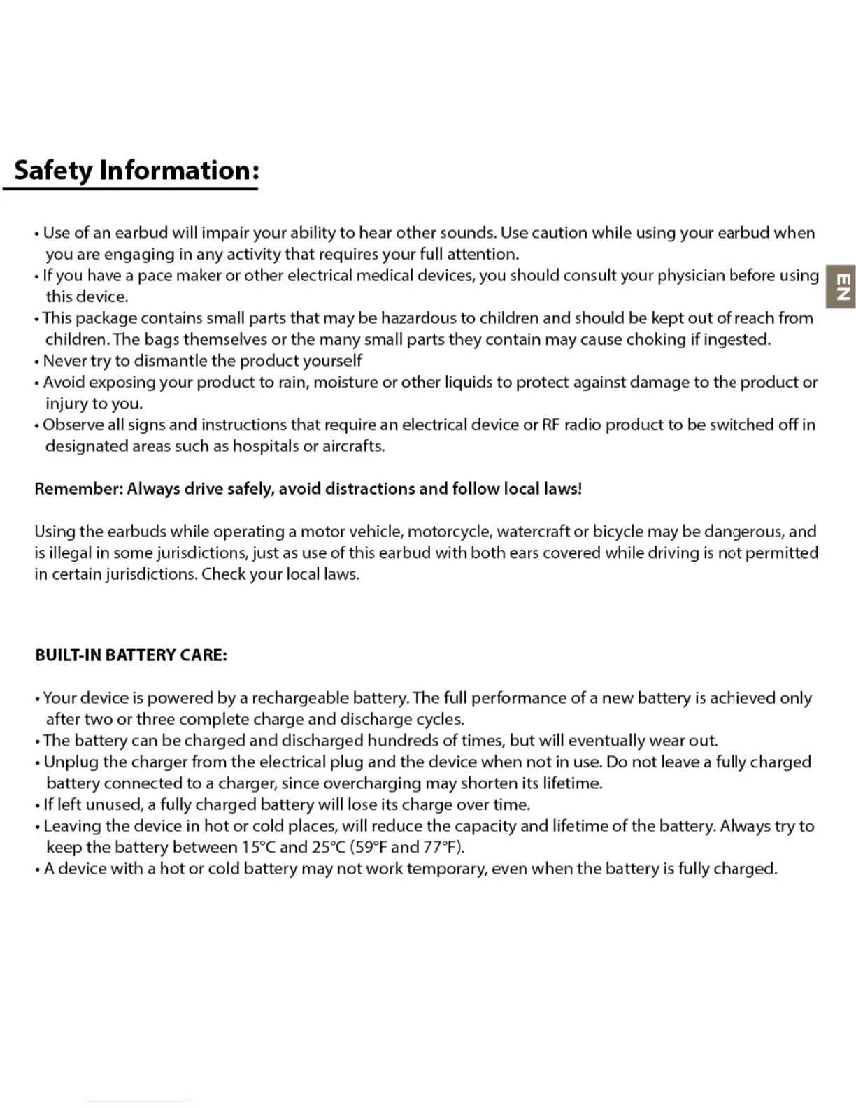 Uunique FREEDOM - Safety Information; General Usage Precautions; Built-in Battery Care