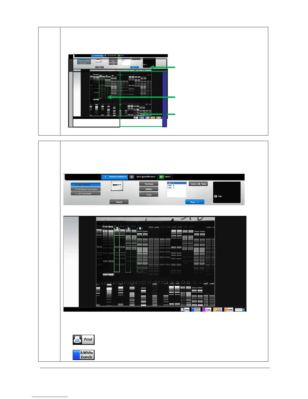 The FireReader 1D operating environment is organised into four areas: