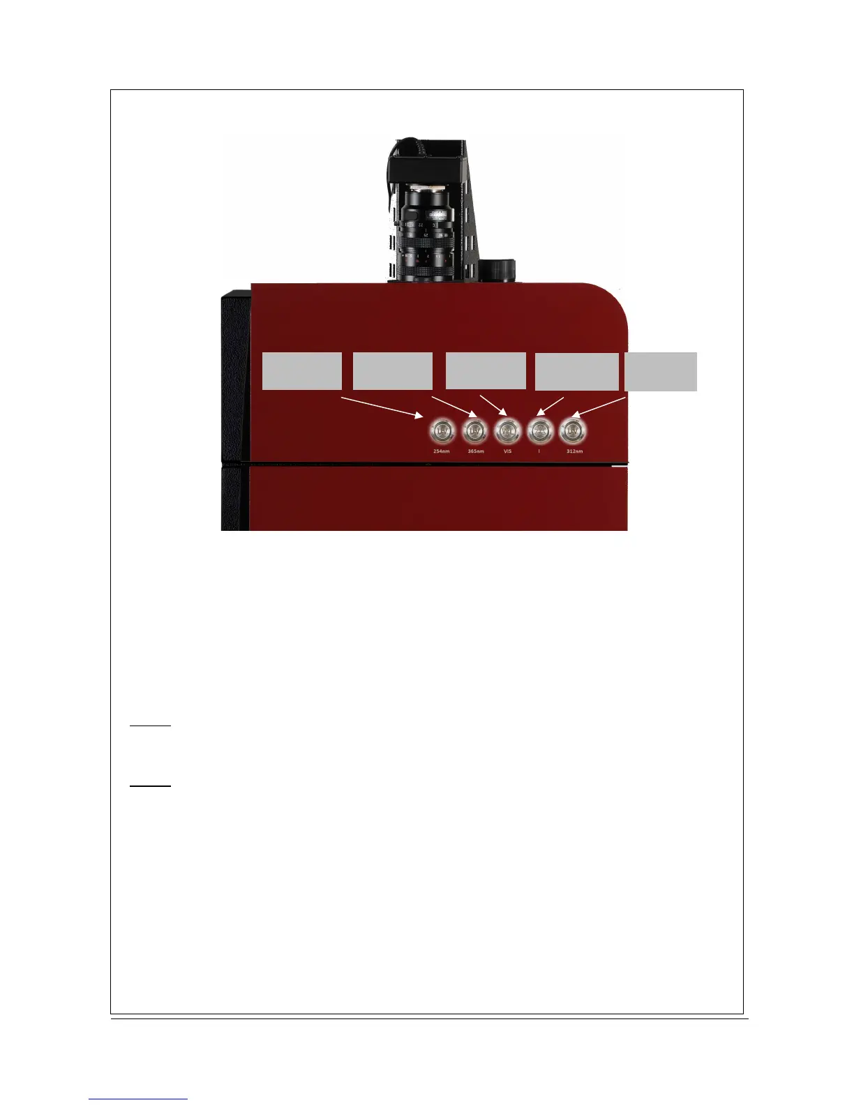 Select the appropriate wavelength: 254 or 365nm. Switch on the epi-UV lamp by pushing the