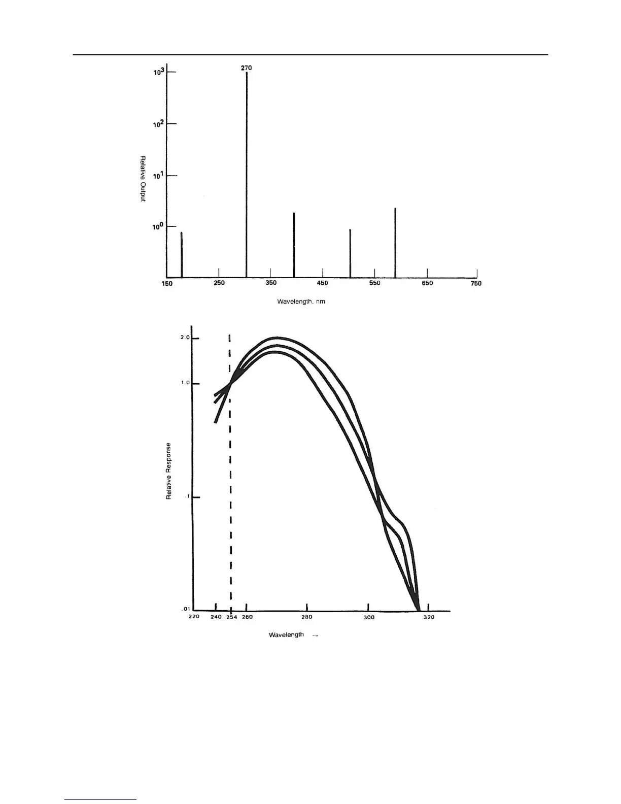 UVP UVX - Figure 14: Hypothetical Light Source Having an Output at 270 Nm Wavelength; Figure 15: Response of Three Sensors Calibrated to Yield the same Output at 254 Nm Wavelength