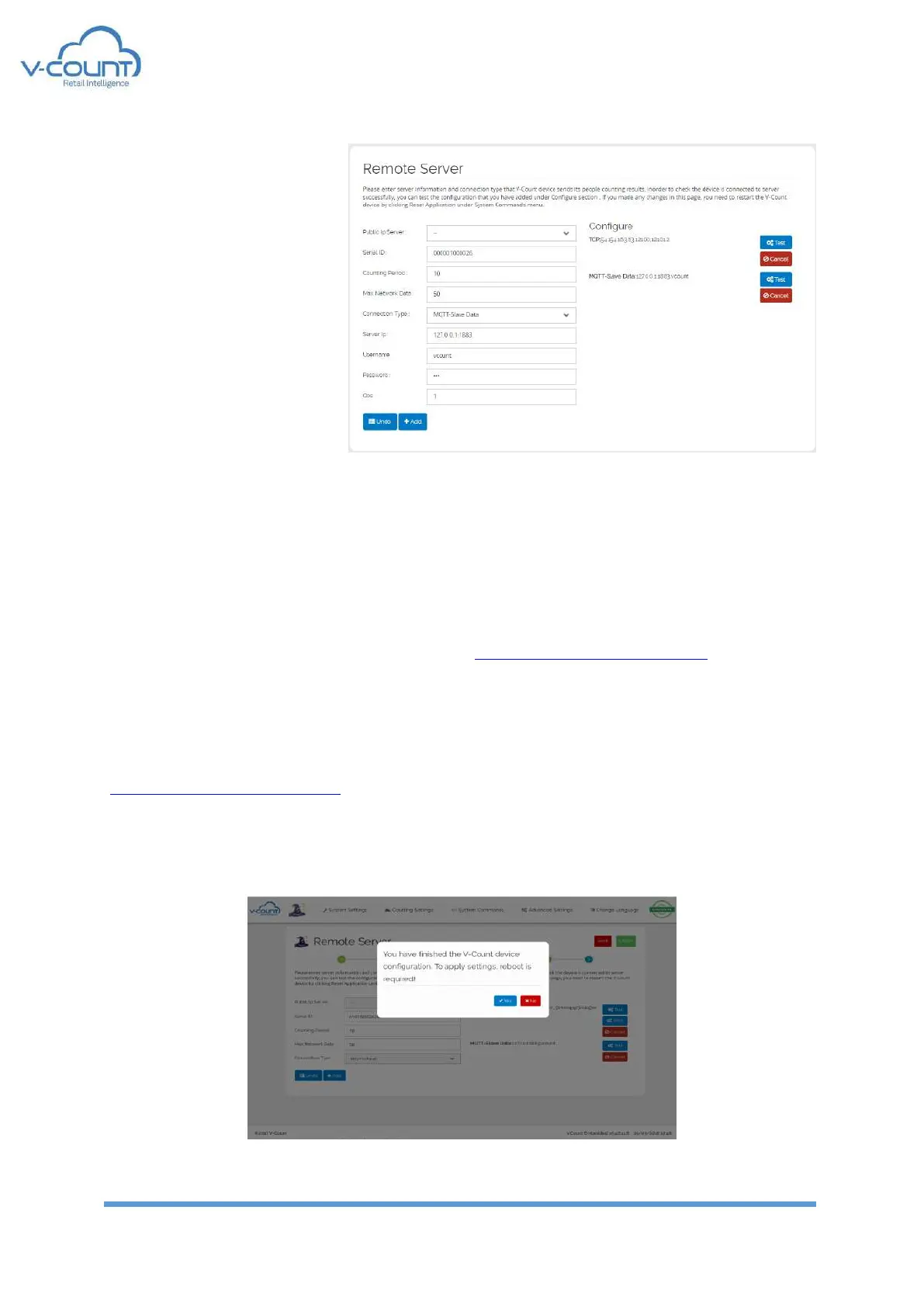 “Test” button sends a dummy data packet to the server to test the configuration.