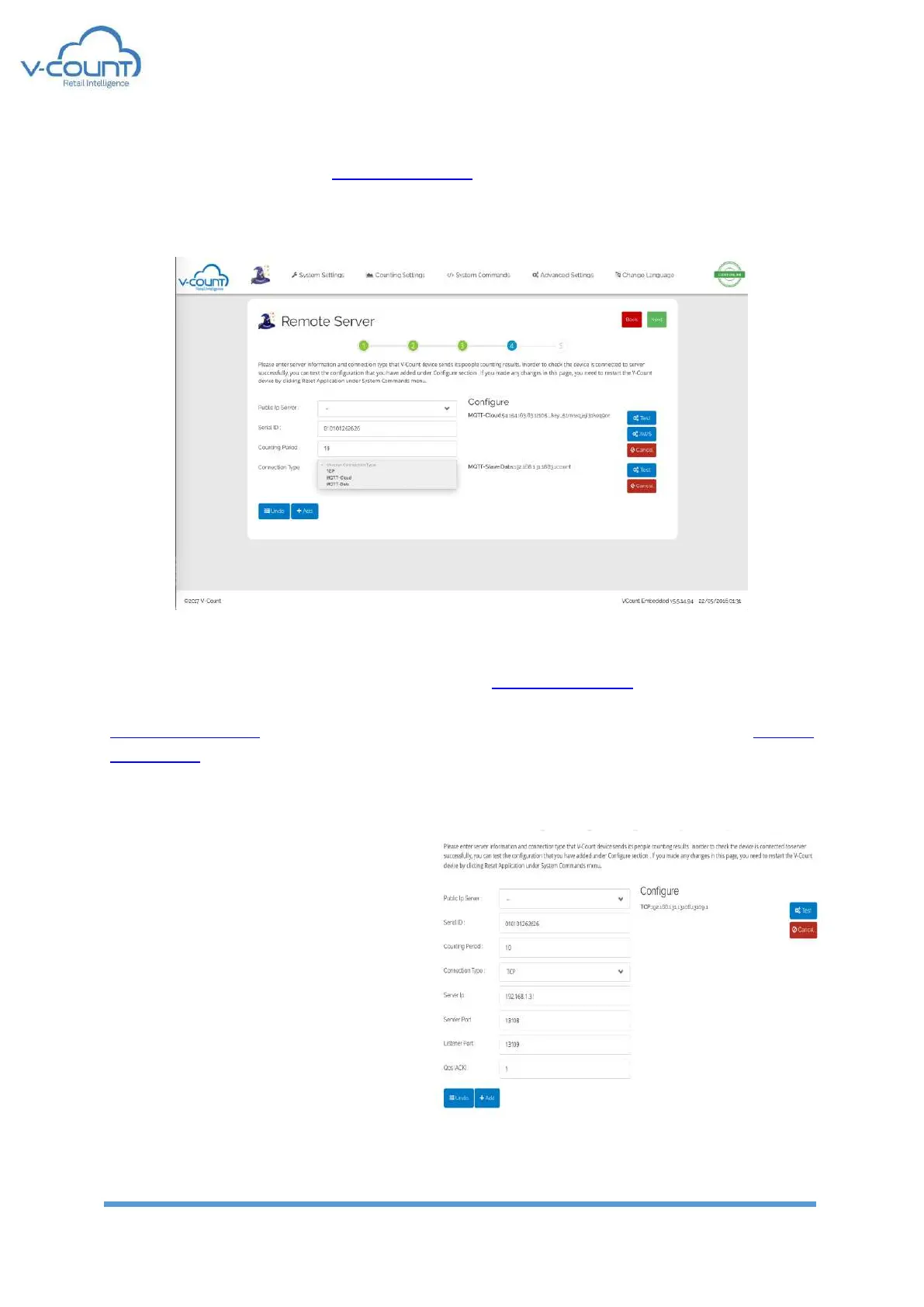 The connection types are TCP, and MQTT. cloud.v-count.com supports only MQTT