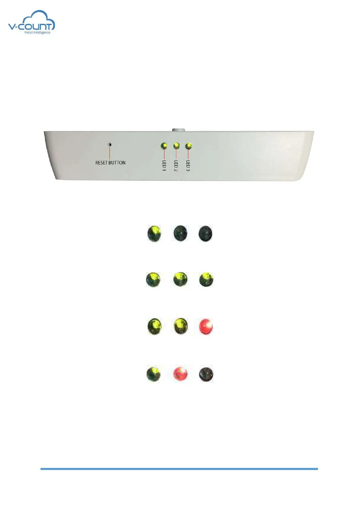 As seen below, V-Count Alpha has 3 LEDs and a reset button on it: