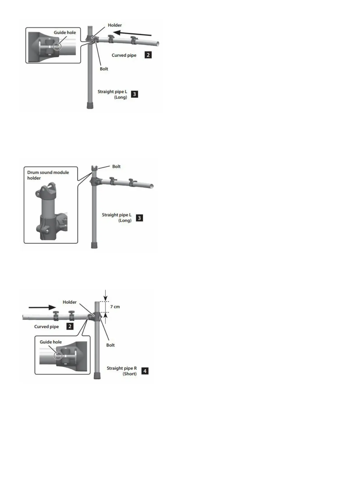 2–3. Using a drum key, loosen the bolt on the holder of straight pipe “R” (short) then insert curved pipe.