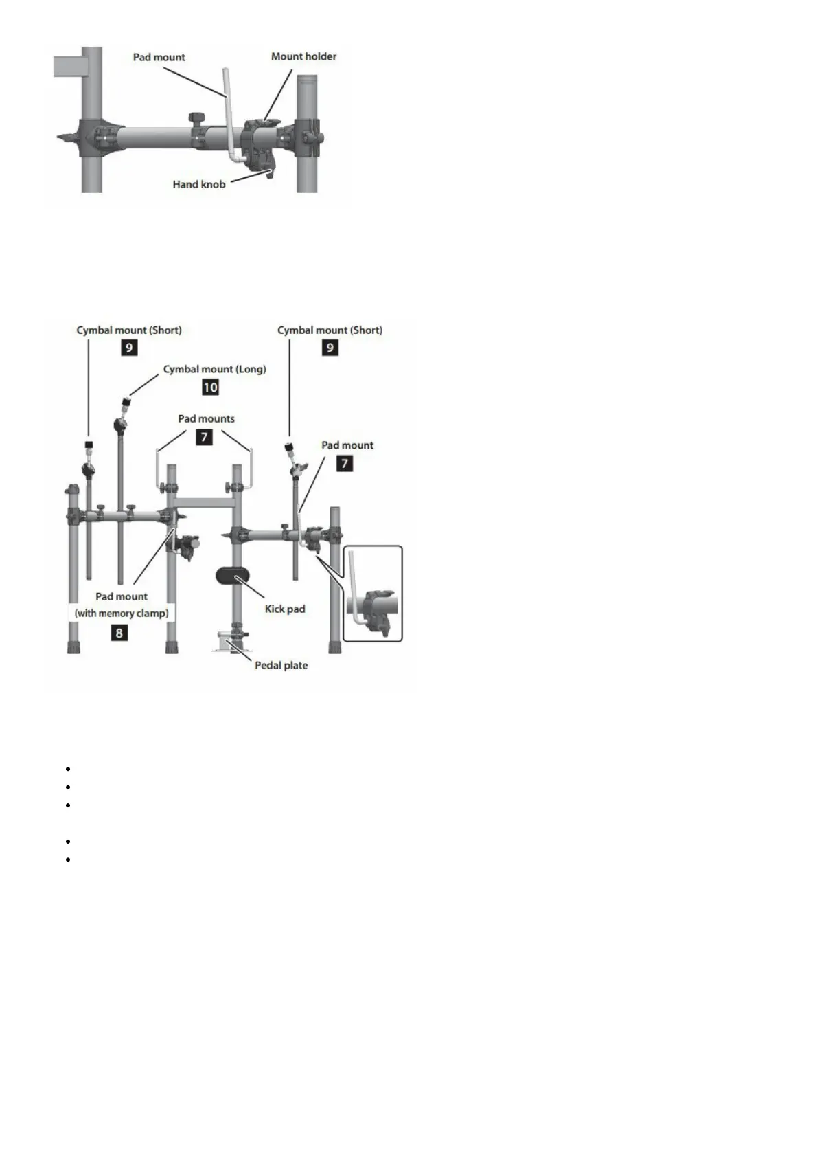 Attach the pad mounts and cymbal mounts as shown in the illustration.