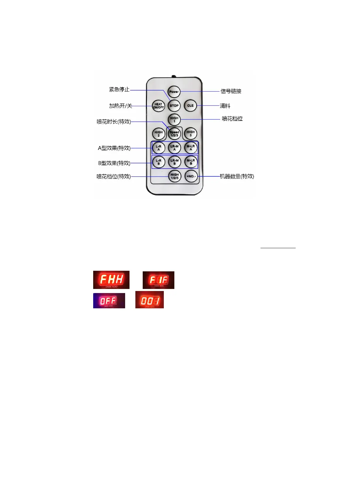 三)按键使用说明:遥控分为两部分,基础功能键;特效喷花功能键(黑色线框内)
