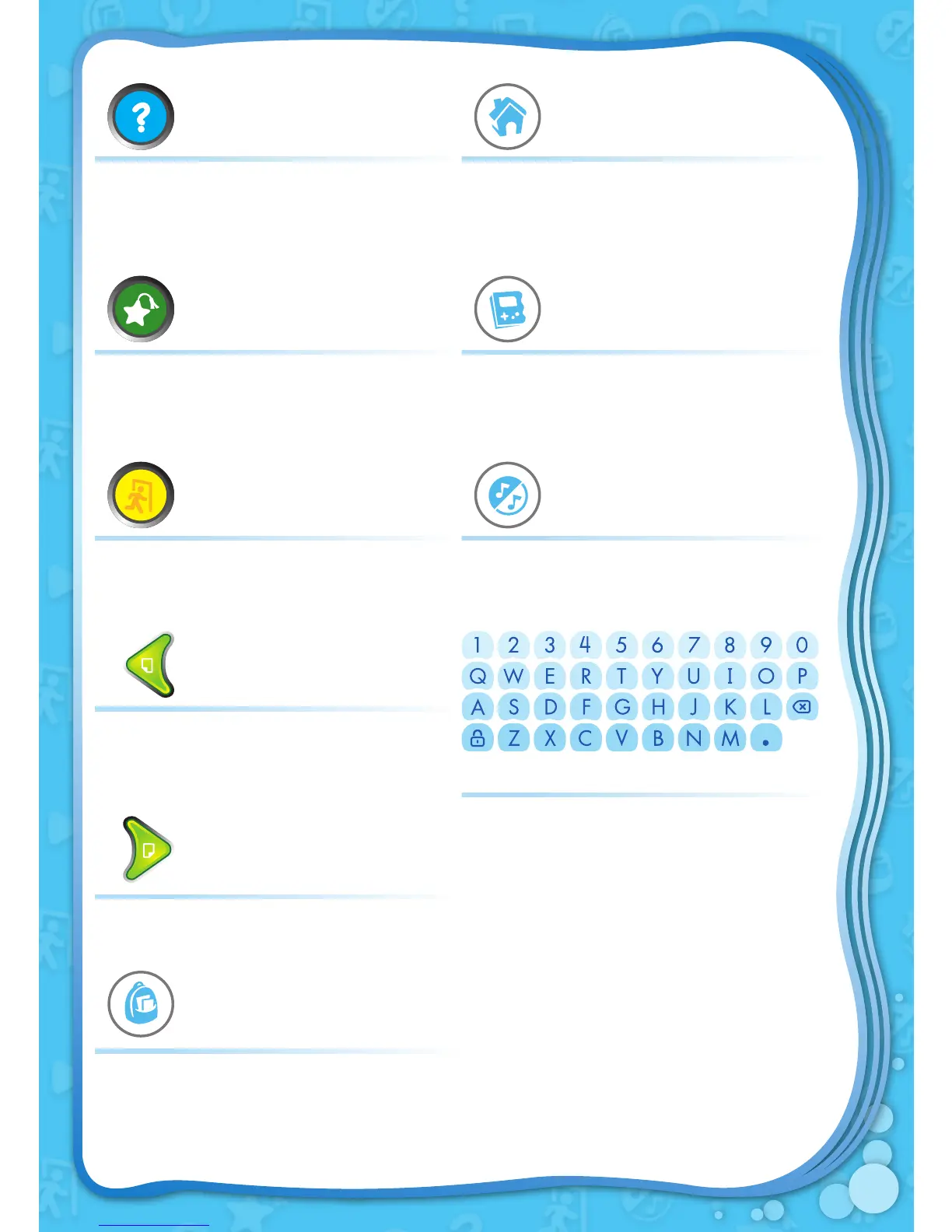 Exit to the previous menu. Turn the background music on/off.