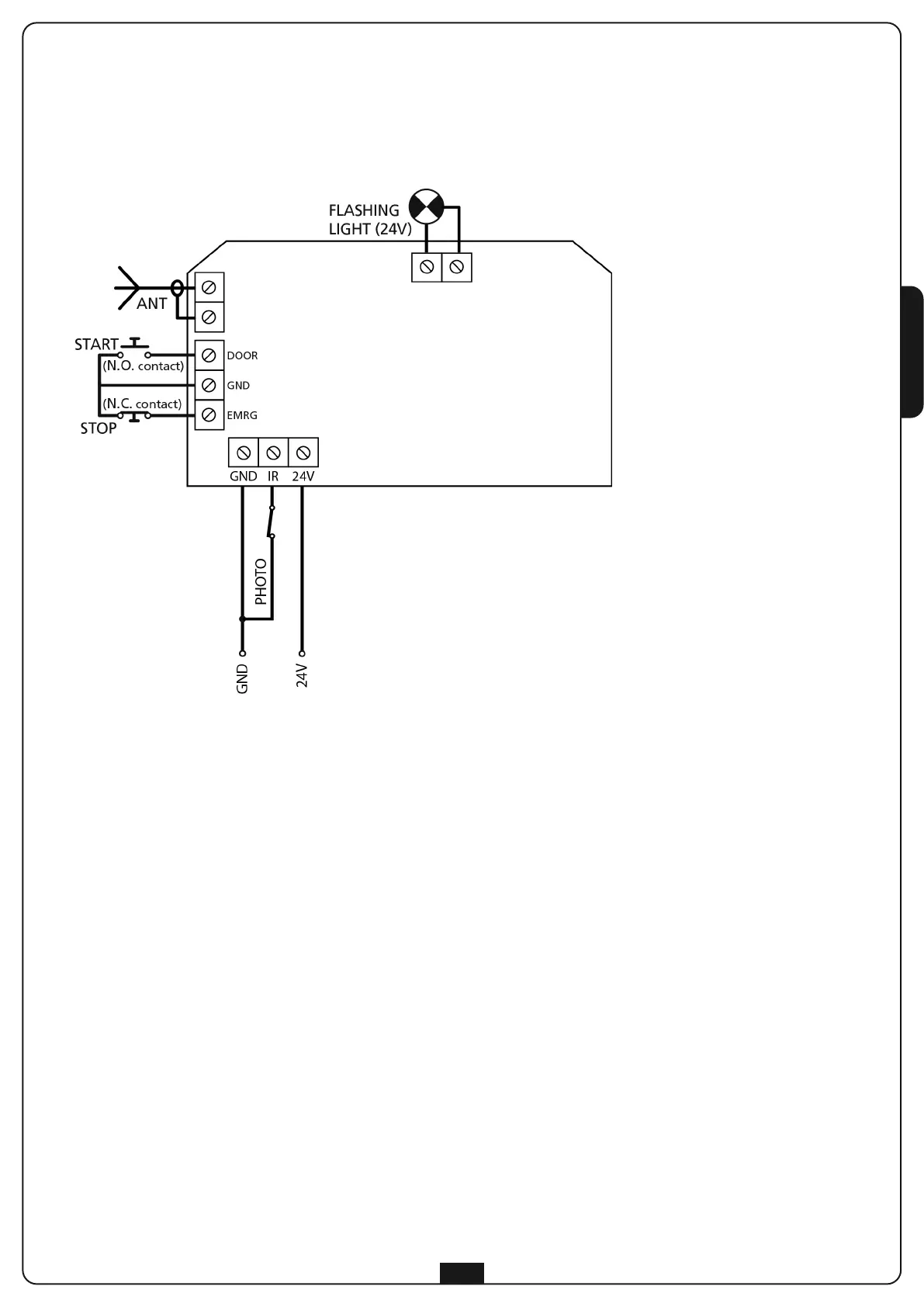 Pour le branchement des photocellules et du bouton de START veuillez vous référer au schéma ci-dessous :