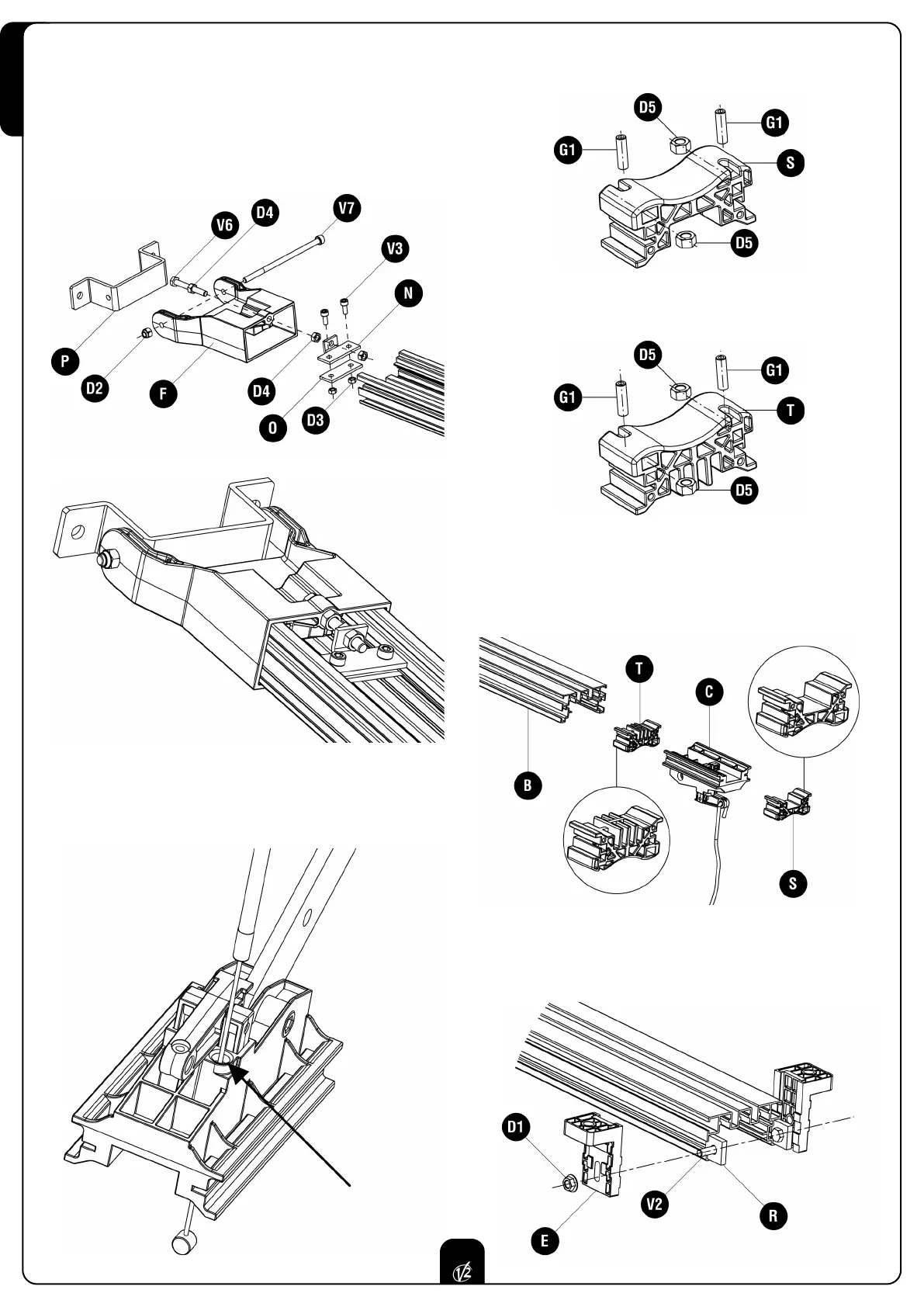 2.0 Montare i supporti di fissaggio E: inserire i bulloni V2 e le