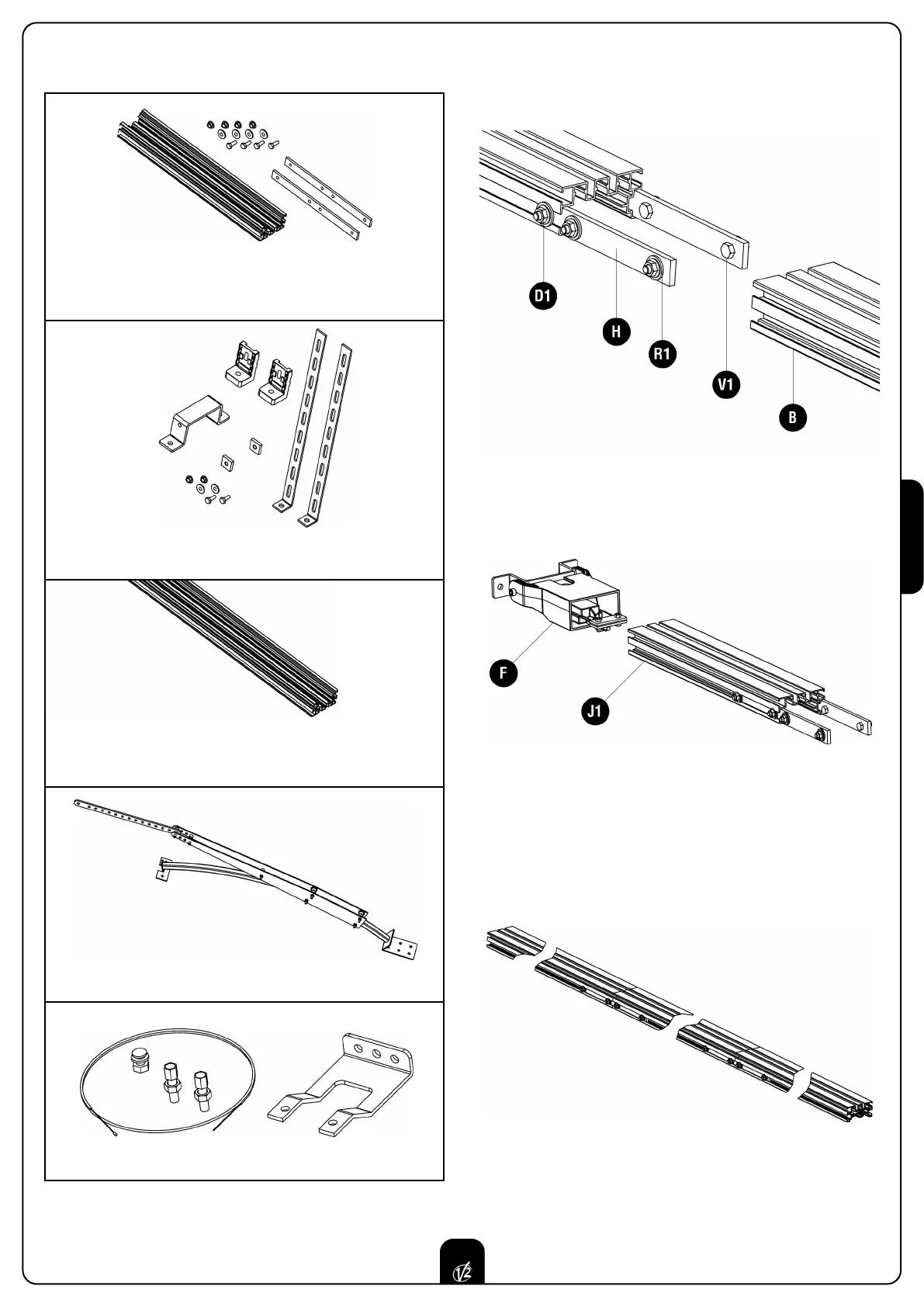 de junção H, os parafusos V1, as porcas D1 e as anilhas R1.