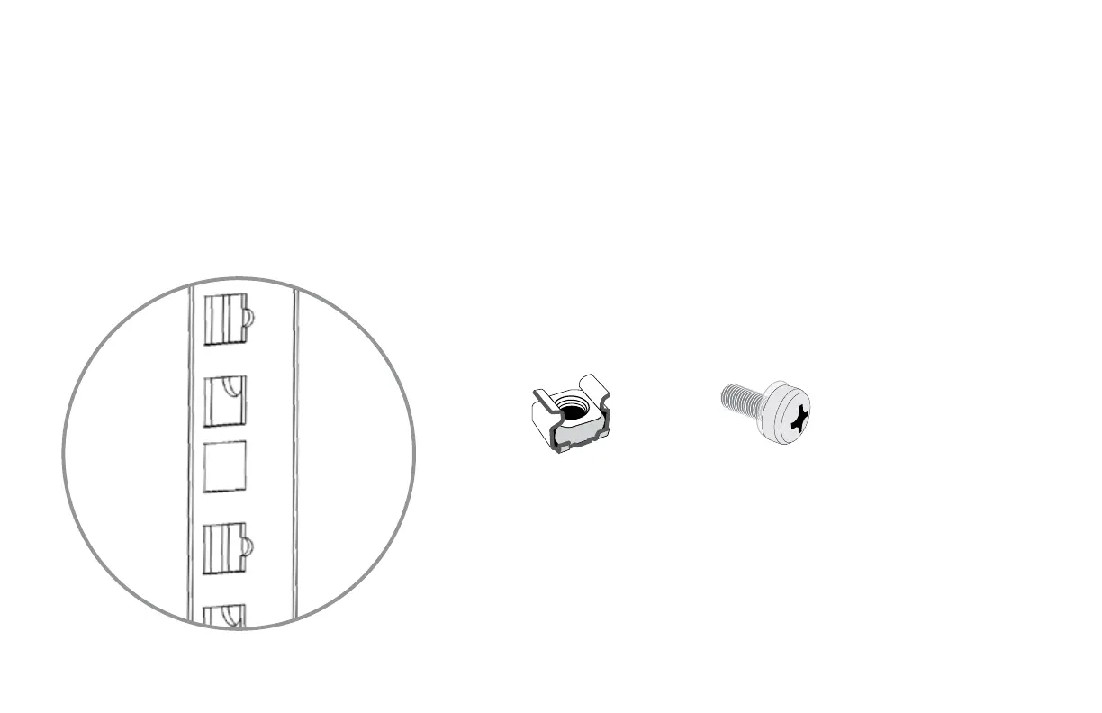 The enclosure comes with mounting rails that have square holes for mounting rack equipment. To install equipment, use the included cage nuts and other hardware.