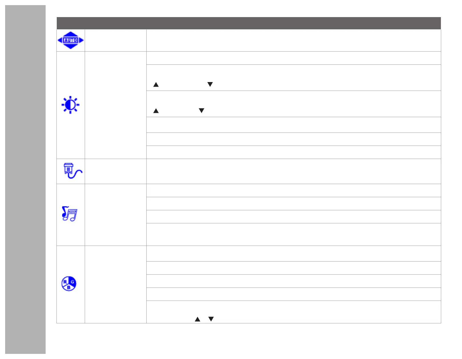 Ajuste automático Para ajustar la posición horizontal, posición vertical, Fase (Ajuste idóneo) y Reloj (tamaño H) de la pantalla.