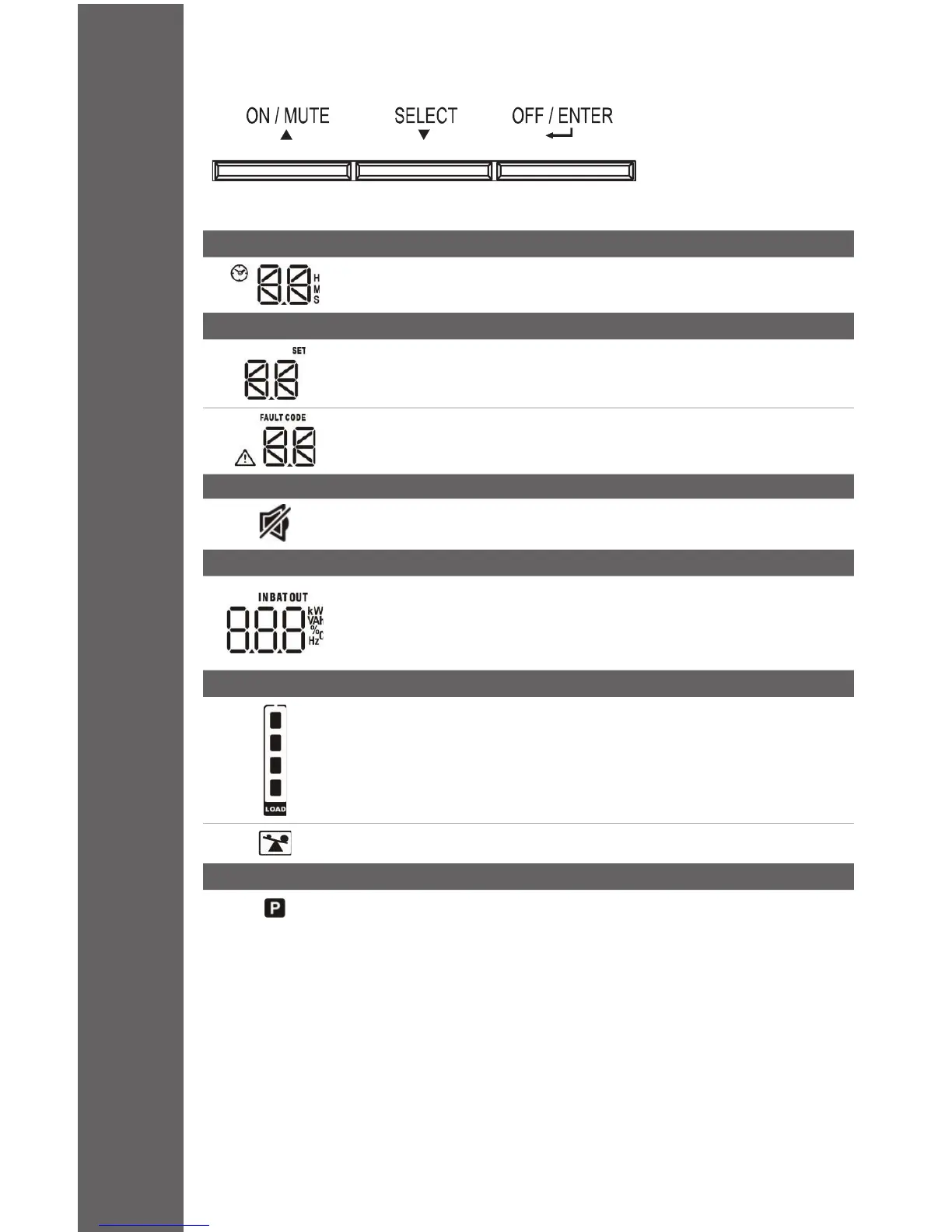 Indique la tension d'entrée, la fréquence d'entrée, la tension et la capacité des batteries,