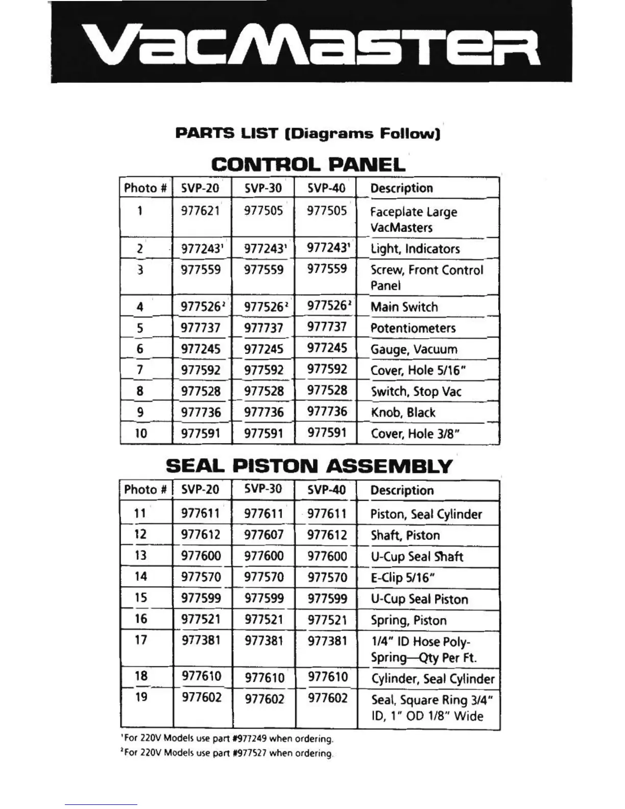 Vacmaster SVP-20 - PARTS LIST (Diagrams Follow)