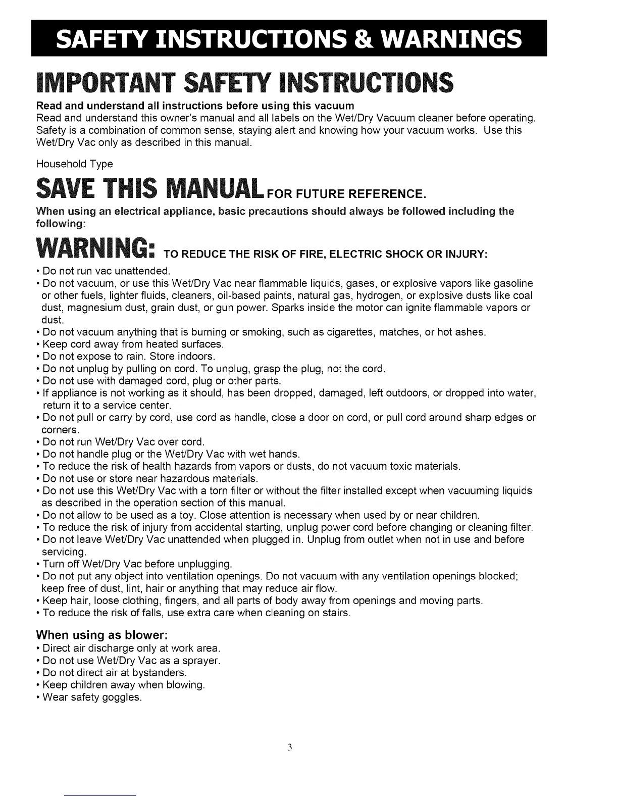 • Do not vacuum, or use this Wet/Dry Vac near flammable liquids, gases, or explosive vapors like gasoline
